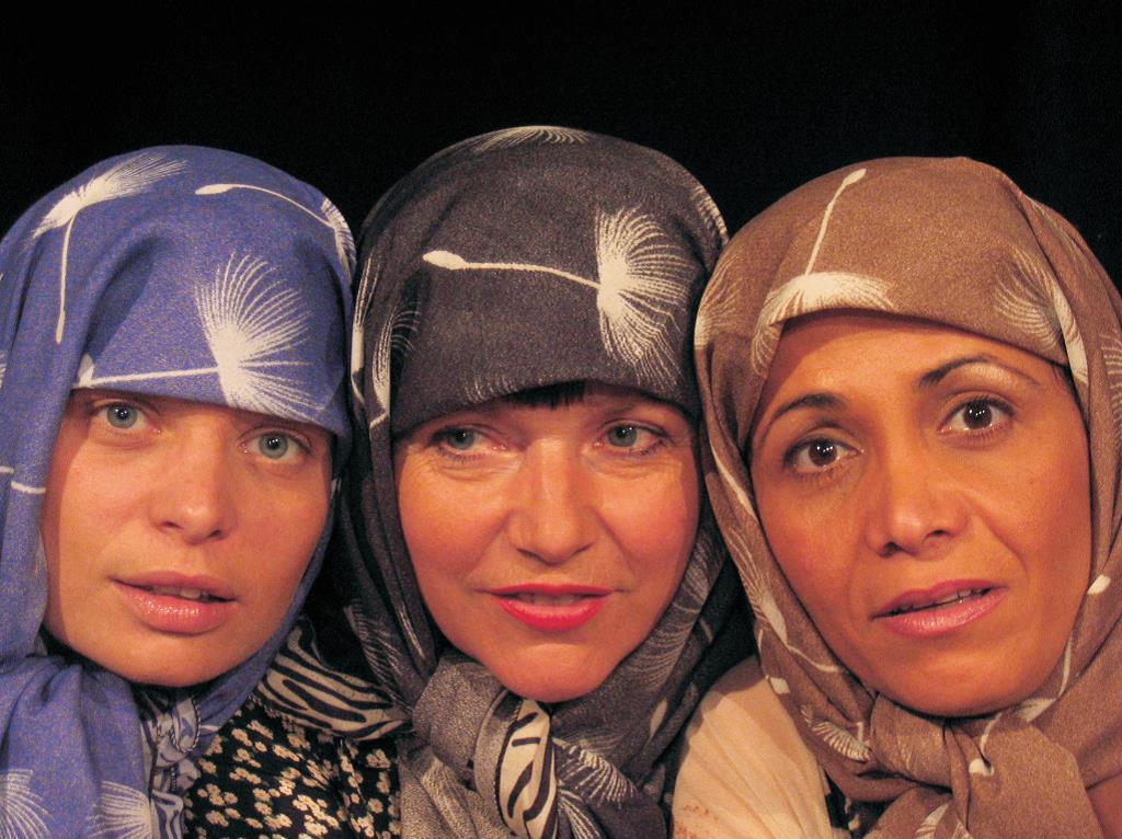 تم نشر هذا المحتوى على مشهد من مسرحية “لا في الجنة ولا في النار” من انتاج مسرحية مارلام بزيورخ بالتعاون مع المركز الثقافي العربي، وتمثيل من اليمين إلى اليسار: إيمان والي (بون/ بغداد)، وأنّا ماري كوستر (زيورخ)، وكريستين فون هولت (زيورخ).
