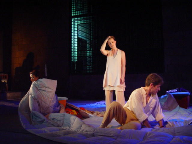مشهد من مسرحية “شهرزاد الآن” بالقاهرة. وفي الصورة الممثلون: بيات برونّو وهاني سليم وسابينا فراي. Maralam