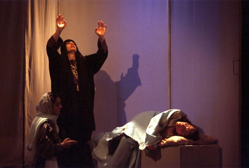 مشهد من مسرحية "مسك الغزال" التي أنتجت بالتعاون بين مسرح مارلام السويسري ومسرح عشتار الفلسطيني، وفي الصورة الممثلة سهى باسم. يروي هذا العمل الفني قصّة أربع نساء التقيْن في إحدى الصحاري العربية يعانين من مشاعر الغربة والإغتراب. محاولة لإزالة الستار عما هو مستور في عالم تحكمه جملة من المحرّمات والمسلّمات. maralam