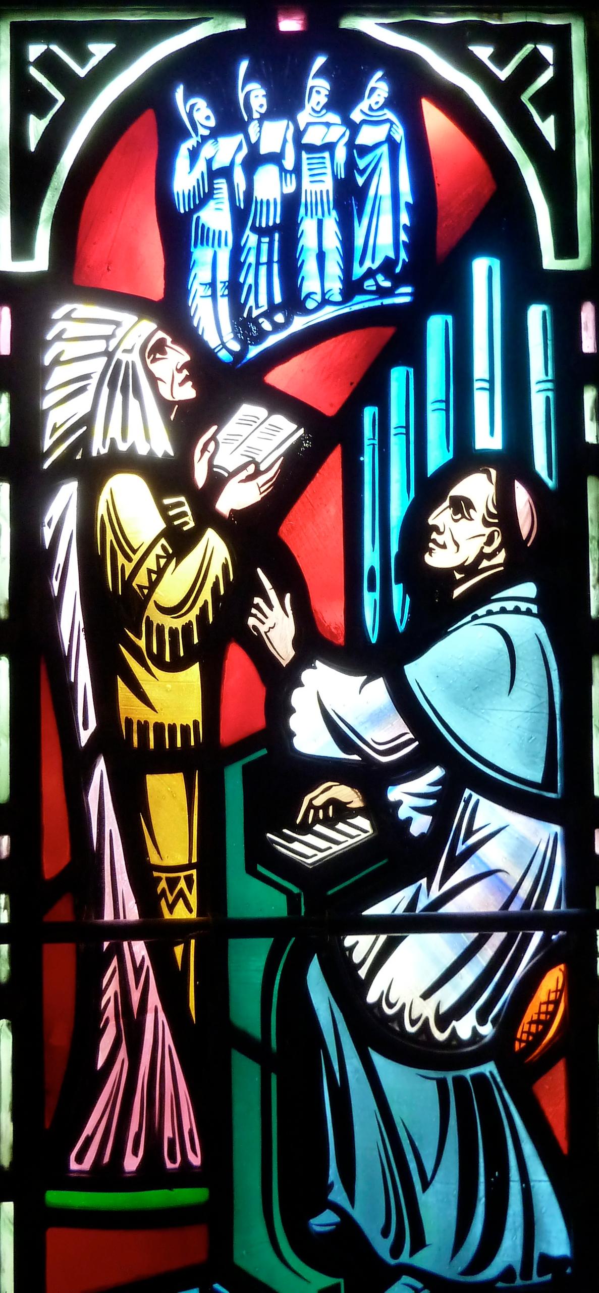 في الكنيسة الصغيرة التي تحمل اسمه، تُذكرنا إحدى النوافذ بالمحاولة (الفاشلة) التي أقدم عليها مارتن في نهاية سبعينيات القرن التاسع عشر لتنصير الزعيم الهندي المقاوم والملقب بـ ‘الثور الجالس’، هذا قبيل أن يُردى قتيلاً بالرصاص. كما تعكس اللوحات المرسومة على الزجاج، نظرة مارتي إلى هذا الزعيم الكبير باحترام وتقدير، بينما تنشد نساء من الهنود الحمر في الخلفية، حاملات كتب الأناشيد في أيديهن.