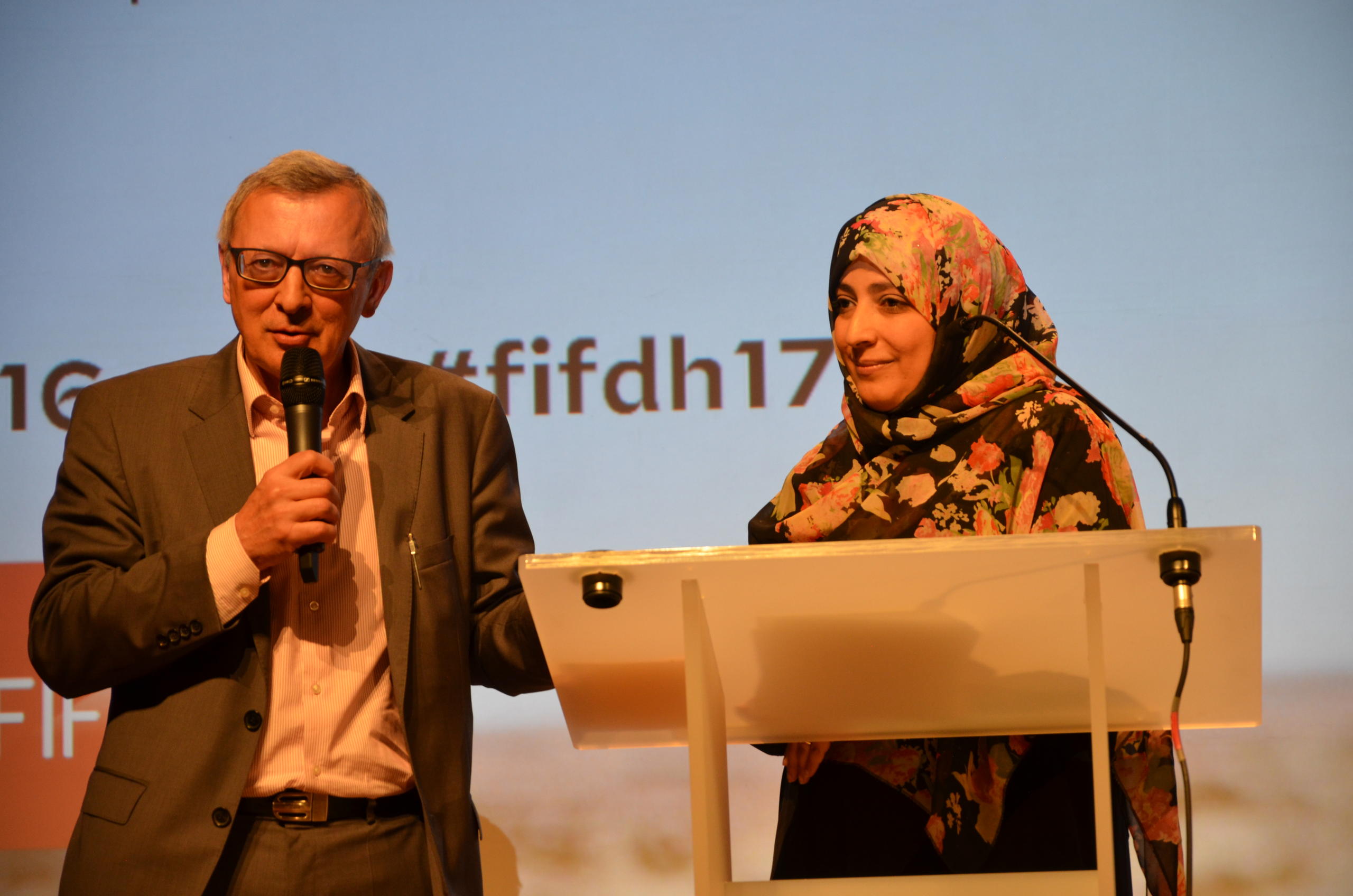في جنيف أيضا، سبق للسيدة توكّل كرمان، الناشطة اليمينة والحقوقية المتحصّلة على جائزة نوبل للسلام أن شدّدت في كلمة ألقتها خلال الأمسية التي خصَّصها مهرجان الفيلم والمُنتدى الدولي لحقوق الإنسان بجنيفرابط خارجي خلال دورته الأخيرة للأوضاع في اليمن على أن المطلوب اليوم في بلدها هو صُنع سلام مُستدام وإنهاء الإجراءات الإنقلابية والعودة إلى ما سَبَق أن توافق عليه اليمنيون قبل الانقلاب. كما ناشدت الأمم المتحدة والمنظمات الإنسانية ومجموعة العشرة والدول العربية بتقديم مساعدات شاملة وعاجلة لإنقاذ ملايين اليَمَنيين الذين يتهددهم خطر المجاعة اليوم.
