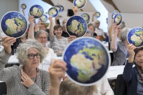 نساء يرفعن بطاقات مستديرة تصور كوكب الأرض