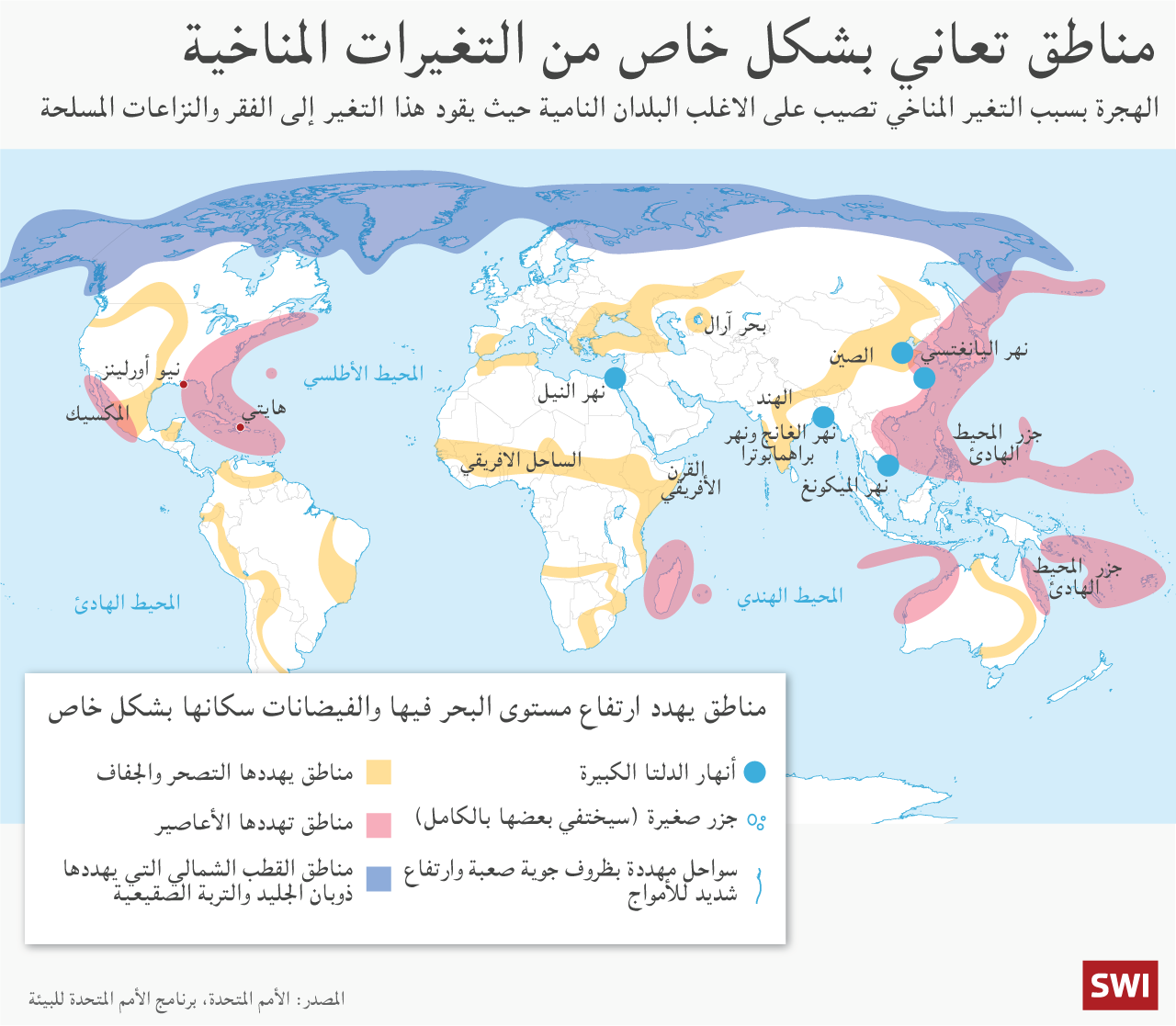 احتل لاجئو المناخ عناوين وسائل الإعلام الدولية، وتَرَدَّد صَدى حكاياتهم بِشكل موازٍ لحكايات اللاجئين المُتأثرين بالنزاعات المسلحة. لكن الموضوع مُعقد للغاية كما يقول الخبراء. وفي هذا المجال، يُعَد مِنبر النزوح الناجم عن الكوارث، الذي يتخذ من جنيف مقراً له أحد المنظمات العاملة في هذه القضية وهي واحدة من أكبر التحديات التي تواجه الإنسانية في هذا القرن.