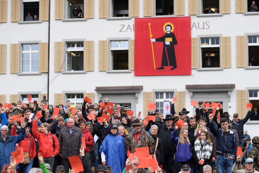 راقصات وراقصون يرفعون الأعلام السويسرية
