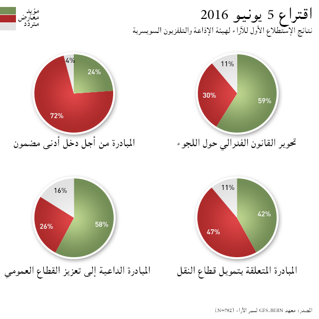 سبر الآراء الذي أُنجز بتكليف من هيئة الإذاعة والتلفزيون السويسرية – المؤسسة الأم لـ swissinfo.ch – ونُشرت نتائجه يوم الجمعة 29 أبريل توصل إلى أن المبادرة لا تحظى بتأييد سوى 24% من المستجوبين، فيما قُوبلت بالرفض من طرف 72%، أما نسبة المترددين فلم تتجاوز 4%.