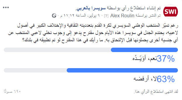 في الواقع، كان المقترح مفاجئا للجميع في بلد يتميّز فيه المنتخب الوطني لكرة القدم بتعدديته الثقافية وبالإختلاف الكبير في أصول لاعبيه الإسبانية والبرتغالية والبلقانية والإفريقية، لذلك سألنا قراءنا عن رأيهم في الفكرة التي طرحها نائب رئيس الرابطة السويسرية لكرة القدم لو تم تطبيقها في بلدهم وكانت نتيجة التصويت الذي شارك فيه 690 شخصا على فيسبوك واضحة حيث أعرب 63% عن رفضهم لها فيما أيّدها 37% منهم. أما على موقع تويتر حيث شارك في التصويت 123 شخصا، فقد كانت نسبة الرافضين 41% والمؤيّدين 46% فيما قال 13% إنهم بدون رأي.