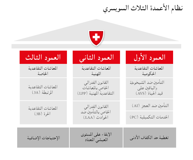 قبل التطلع إلى رفع سن التقاعد، ترى النقابة السويسرية للخدمات العامة أنَّ الأولى هو رفع المعاشات التقاعدية، معتبرة أن الأرقام الحالية للعمود الأول لا تسمح وحدها بعيش حياة كريمة في سويسرا. ومع ذلك، فإن «أقلية ضئيلة من الأشخاص تسمح لهم ظروفهم بالعمود الثالث المُمَول من الادخار الخاص وأكثر من 40% من المتقاعدين الجدد ليس لديهم حتى العمود الثاني»، كما تقول النقابية.