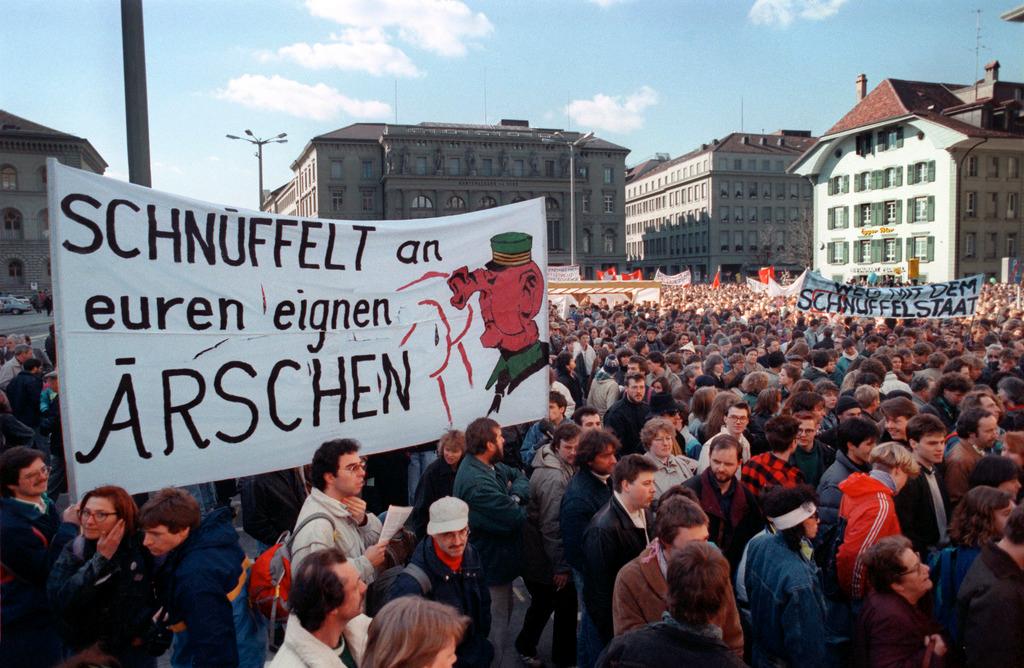 وفي شهر مارس من عام 1990، ونتيجةً للشعور العارم بالإستياء، خرج نحو 35,000 شخص في مظاهرة ضخمة نُظِّمت في العاصمة برن، للمطالبة بإلغاء الشرطة السرية والإفراج عن هذه الملفّات إلى العامة وإنشاء لجنة برلمانية ثانية. وبالمُجمَل، طالب 300,000 شخص بالإطّلاع على الملفات الخاصة بهم.