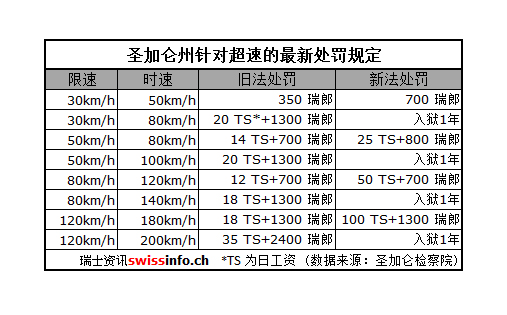 到目前为止,圣加仑对超速的惩罚是最严格的:如果司机在30公里限速范围内,将时速提高到了50,而且被拍照取证,那么等待他的,将是700瑞郎的罚款,而不是之前的350瑞郎。