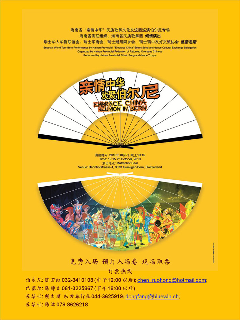 10月7日晚19点15分,海南省民族歌舞团将为侨胞、留学生、瑞中友好人士免费献上民族歌舞表演伯尔尼专场。
