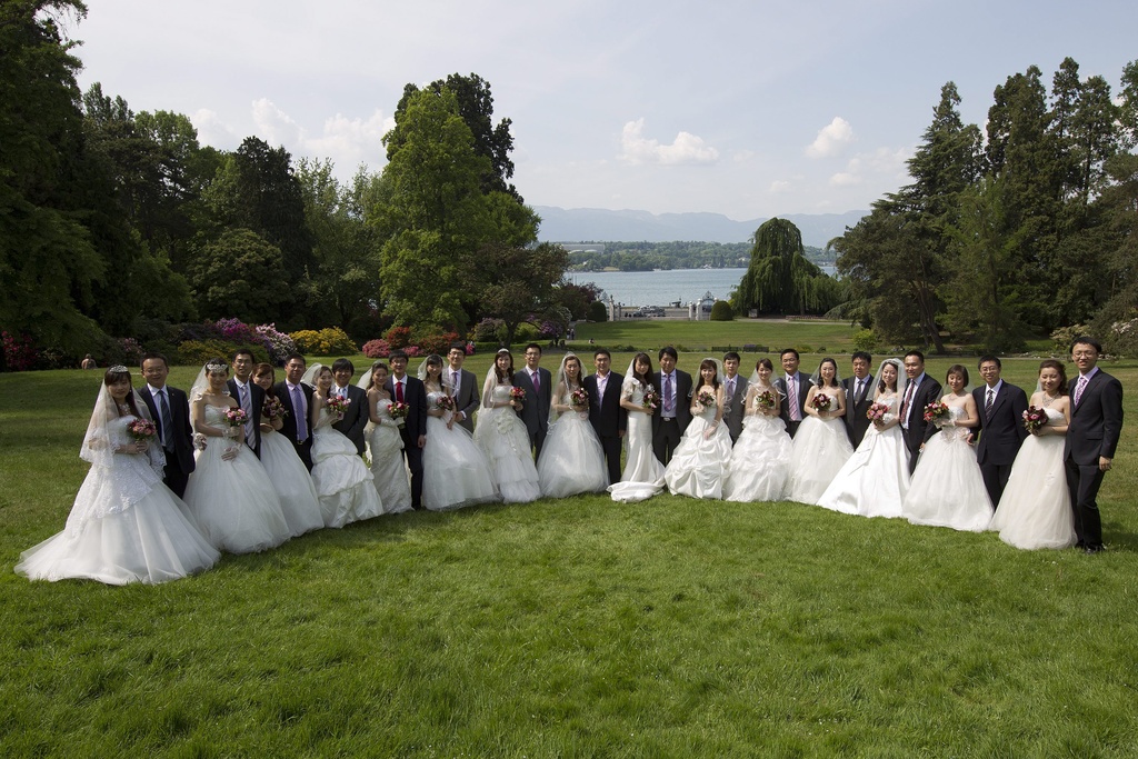 15位身着白色婚纱的中国新娘和她们身穿黑色礼服的夫君们出现在日内瓦喷泉公园的草坪上。他们在汝拉山的见证下、在摄影师的镜头前和路人们好奇的目光中,说出了“我愿意”的婚姻承诺。
