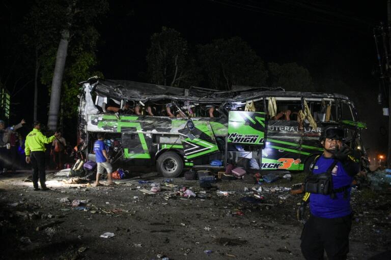 (法新社印尼万隆12日电) 印尼西爪哇一辆满载学生的巴士,昨天晚间失控与另一辆汽车相撞后翻覆,造成11人死亡。