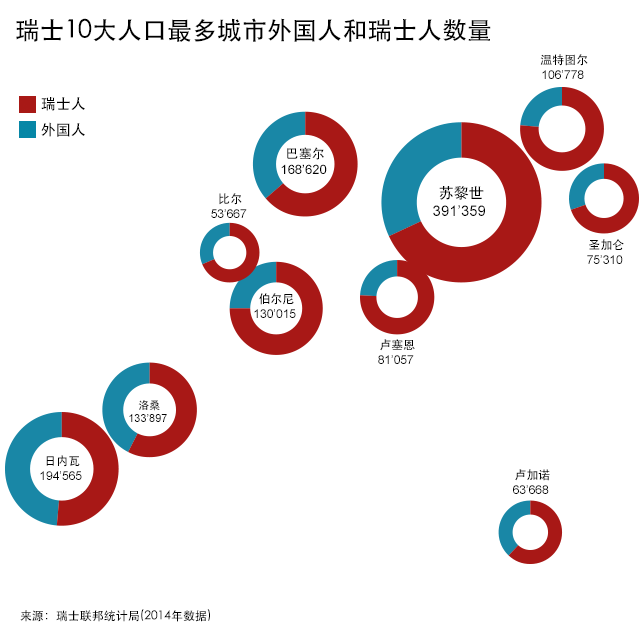 根据联邦统计局的数据,苏黎世作为瑞士人口最多的城市,该市的外国居民人数绝对数字也最高(12’4823人)。但并不出人意料的是,驻有许多国际组织(英)和跨国公司的日内瓦,其外国居民在人口中所占的比例则为瑞士最高。