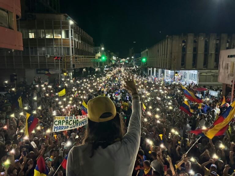 马查多站在1辆卡车的车斗上,向大批支持者挥手致意。夜幕降临时,群众纷纷打开手机的灯光。