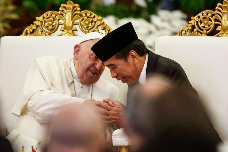 方济各先是与学生握手问好,接着与印尼总统佐科威(Joko Widodo)及多名官员见面。