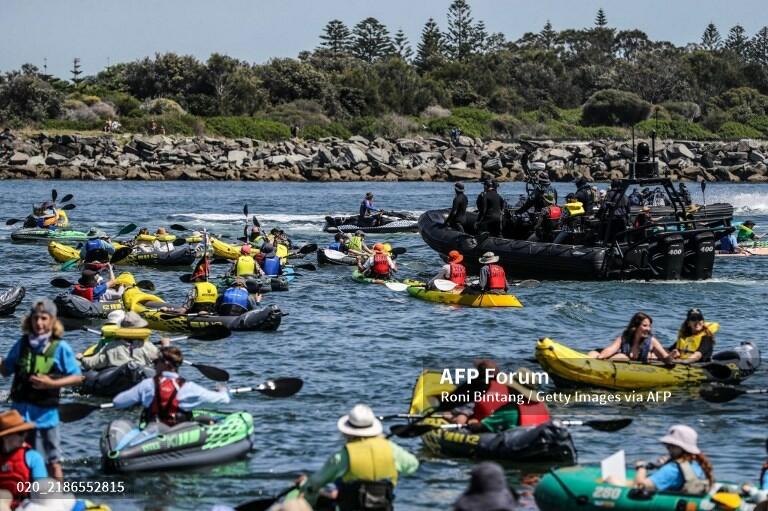 纽卡索港每年有数百万吨煤炭出口。在周末抗议活动中,由独木舟、立桨和充气船组成的船队,将港口入口堵住。