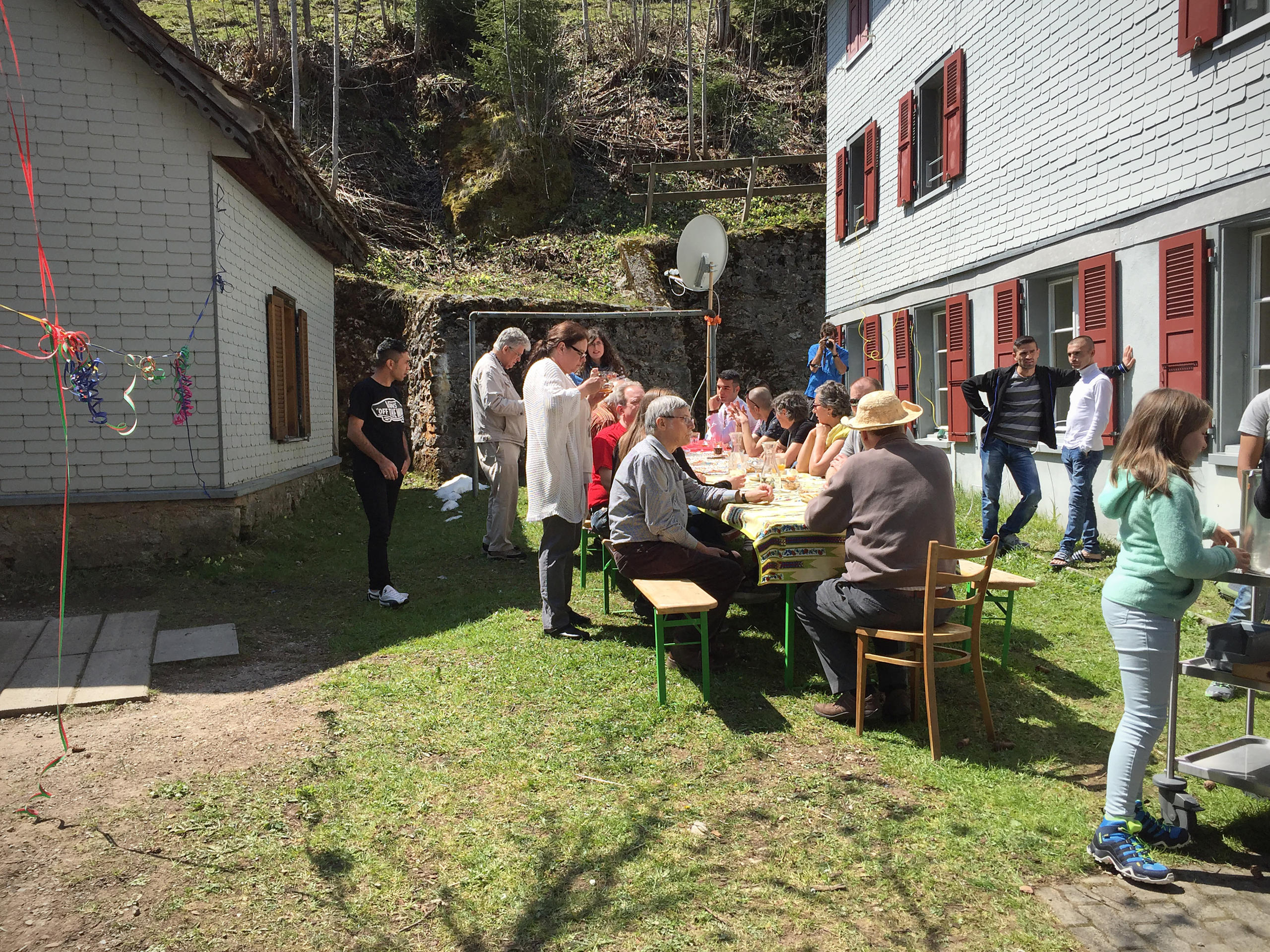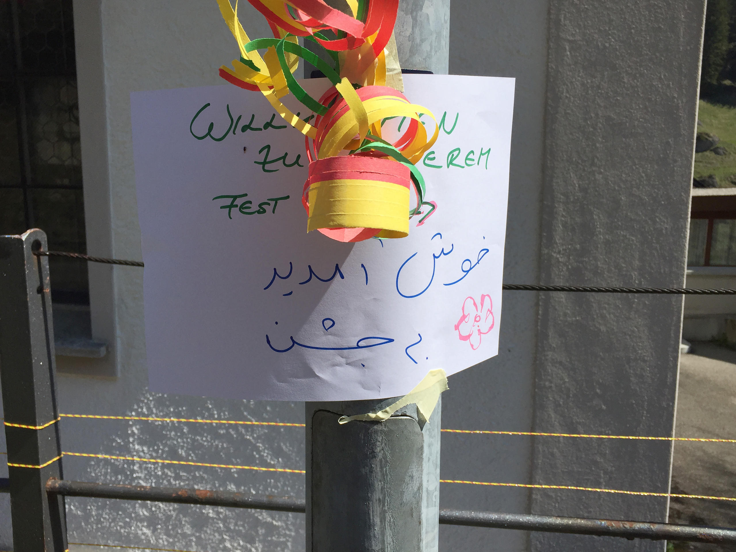 他此行的目的不是登山,而是去拜访陡峭小道尽头的一座大宅子,宅门挂着彩带和手写的标牌-“欢迎来我们的派对!”。标牌的文字除了德语,还有波斯语和乌尔都语。
