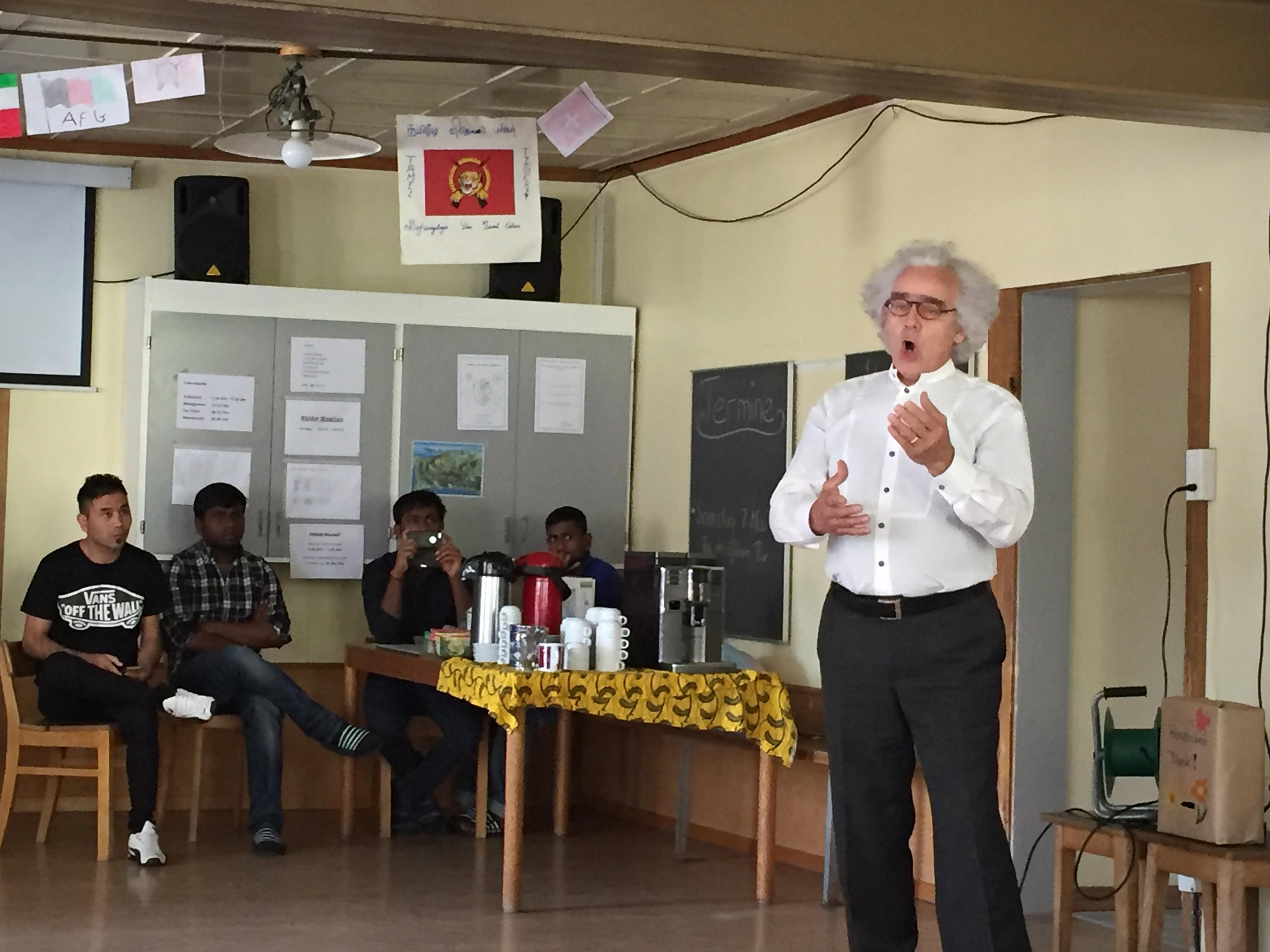 接下来,来宾们被领进里面观看表演。那位酷似马克·吐温的老者独自站在大厅中心,打开一套小音响,放声演唱了一支歌剧咏叹调,两手随着音乐晃动。他名叫基尔希梅耶(Kirchmeier),是位家住瑞吉的专业歌唱家,他常来这儿与难民们共享下午茶,并愿意来参加他们的庆祝活动。