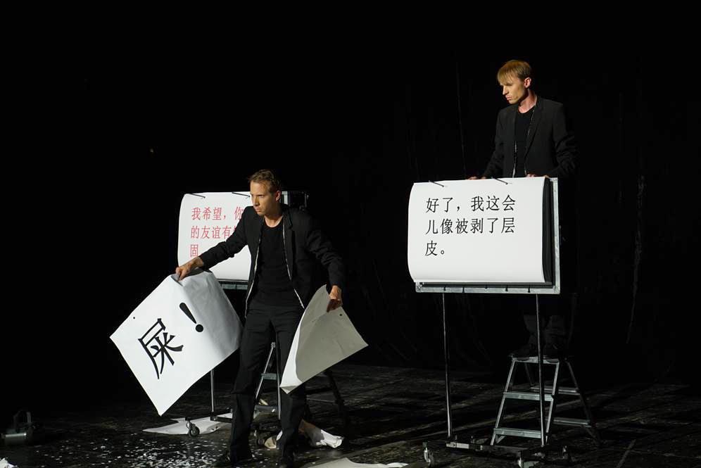 这可能吗?可能,因为Jonas Anderhub和Christoph Wolfisberg表演是无声的。他们的所有对话都被打印成话板,话板纸又被固定在舞台的两块黑板上,而演员则站在黑板后的梯子上,以便随时翻纸。Jonas Anderhub讲道:“这台戏我们已经演了上千次了,主要是用德语,有时用法语。我们一直以来就想为不同文化的观众表演,用阿拉伯语、日语等等。当瑞士文化基金会向我们发出中国演出的邀请,我们欣然答应了下来。”