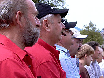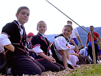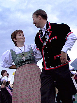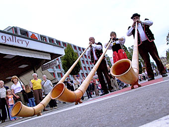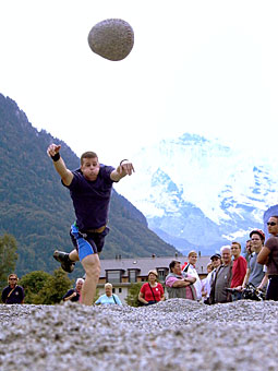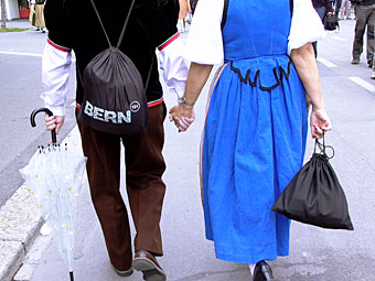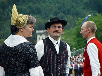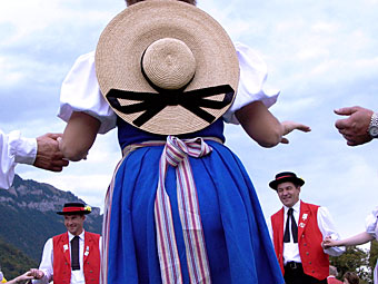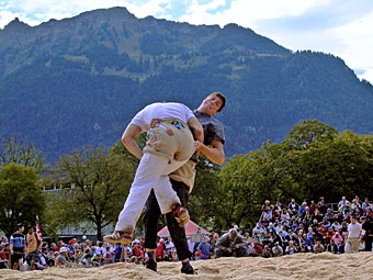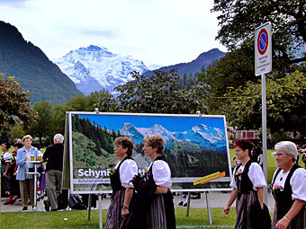 2006年在因特拉肯举办的传统服装和阿尔卑斯牧人节在三天内为年轻人和老年人、城市和乡村提供了一个交接点。强壮的男人较量摔跤和投石技艺;来自全瑞士的约德尔团体展示他们的歌唱和舞蹈才艺。(Bilder: Christoph Balsiger, swissinfo)