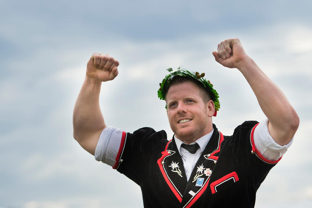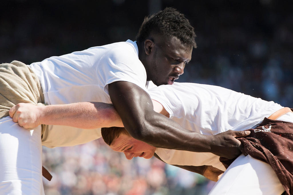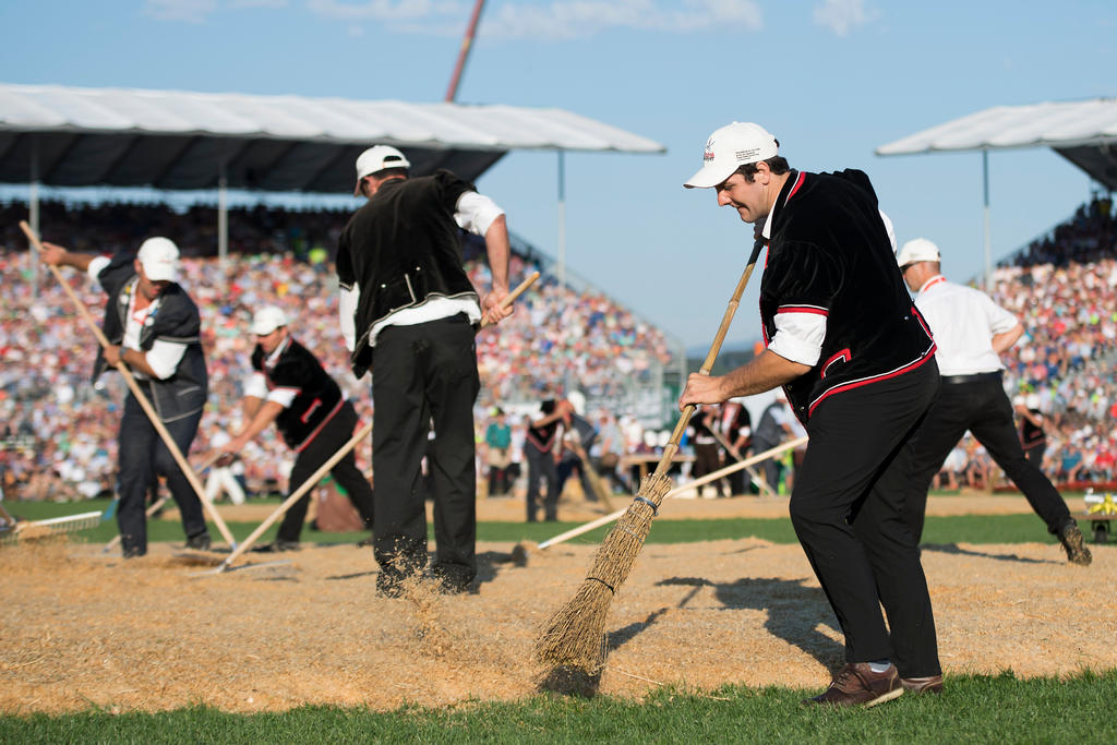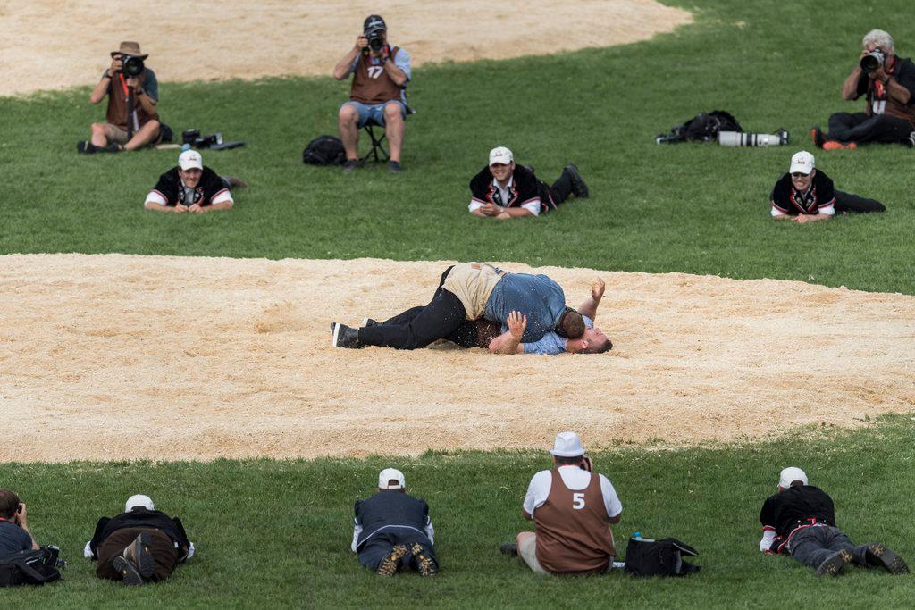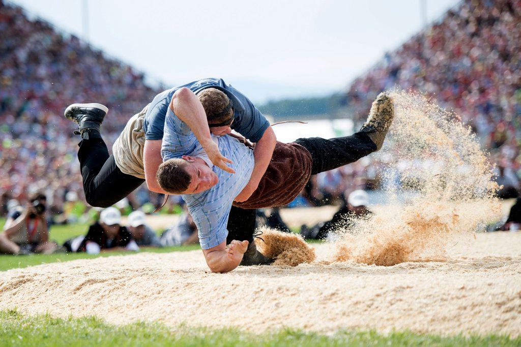 摔跤节举办的上周末大多时间天气炎热,气温有时超过了30°C,如此节日上的太阳帽、墨镜、啤酒需求量大增也就不足为怪了。在广阔的比赛场地,身着传统服饰的女人和女孩,还有男人们,他们嬉闹玩耍,尽情欢乐。但是,这里并非只有摔跤选手在锯末上的挥汗争斗,另外还有舞旗手,投石手也在比赛。