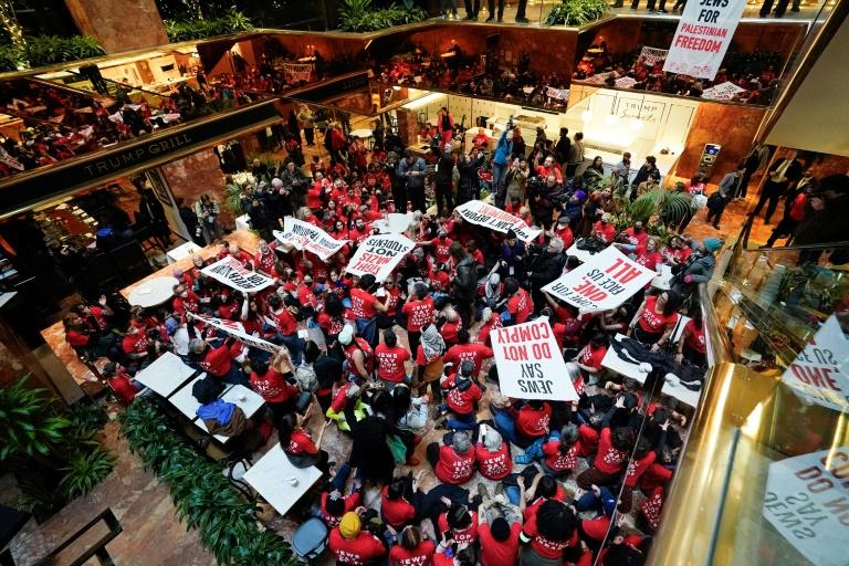 这群示威群众穿着印有「犹太人呼吁停止向以色列提供武器」(Jews say stop arming Israel)字样的红色T恤,在这栋曼哈顿摩天大楼内抗议超过1个小时。总统川普的家族企业总部设于此处,这里也有他的私人住所。