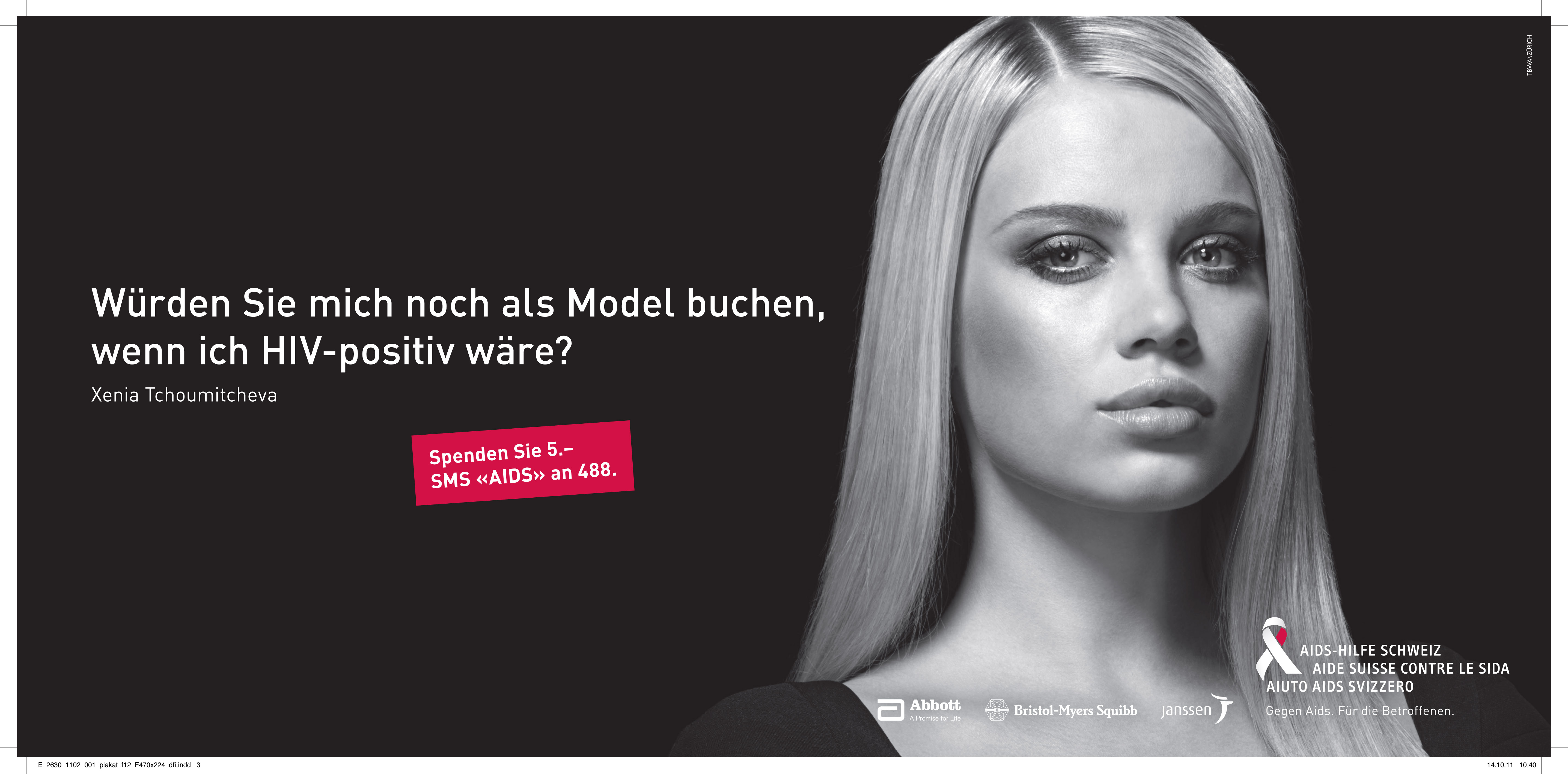 在艾滋病救助组织新发行的宣传海报上,原瑞士小姐、名模兼主持人Xenia Tchoumitcheva目光凝重的注视观者,而旁白写到:“如果我是艾滋病毒携带者,你还会雇我做模特吗?”