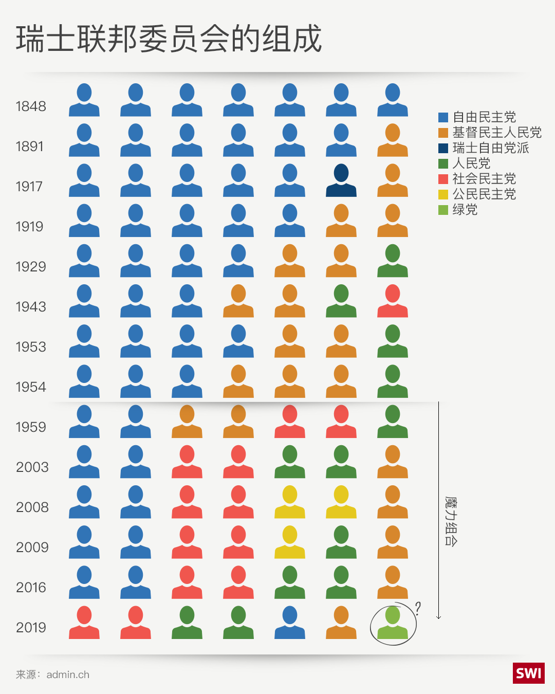瑞士于2019年12月11日进行联邦委员大选。自从同年10月绿党在议会大选中取得压倒性胜利之后 ,瑞士联邦委员中是否应该出现绿党代表这个问题似乎已经毫无悬念,回顾魔力组合的历史,便能找到答案:绿党代表进入联邦是迟早的事。