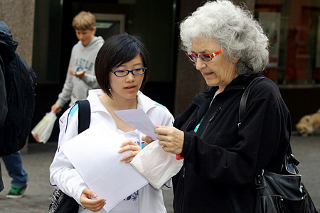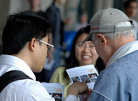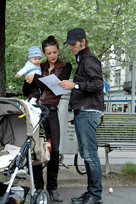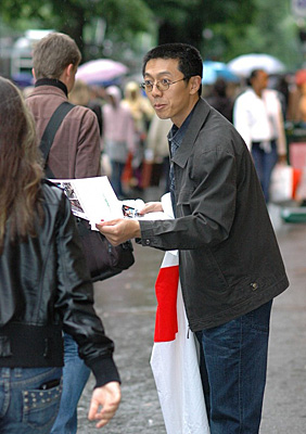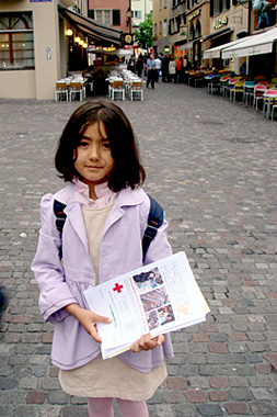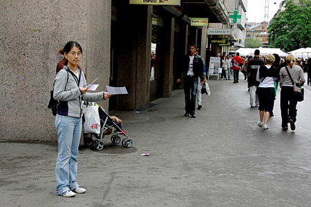 5月17日,中国四川汶川大地震发生后的第五天,苏黎世中国人协会组织了一次向瑞士人发送传单呼吁捐款活动。图为此次活动最小的志愿者feifei也在为分发传单而努力!(所有图片:CUZ摄影师小队:郭奕,范斌,赵川红,洪瑜沁,文字:陈成)