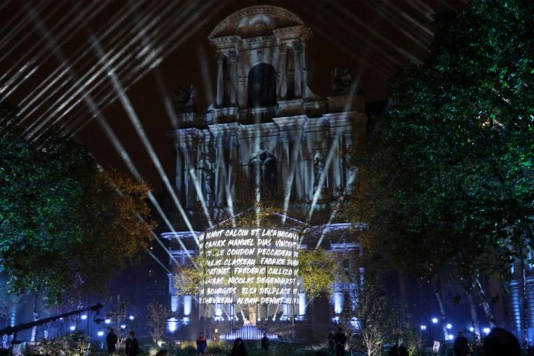 在巴黎市中心举行的追悼仪式上,第一线救难人员缓缓念出那个周五晚上的罹难者,以及两名后来自尽的生还者姓名。