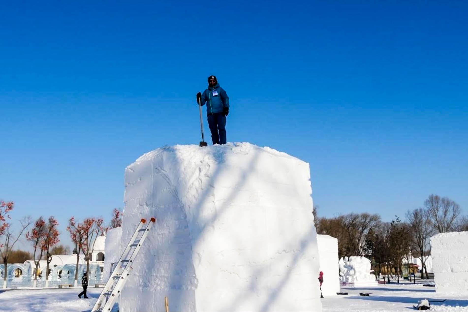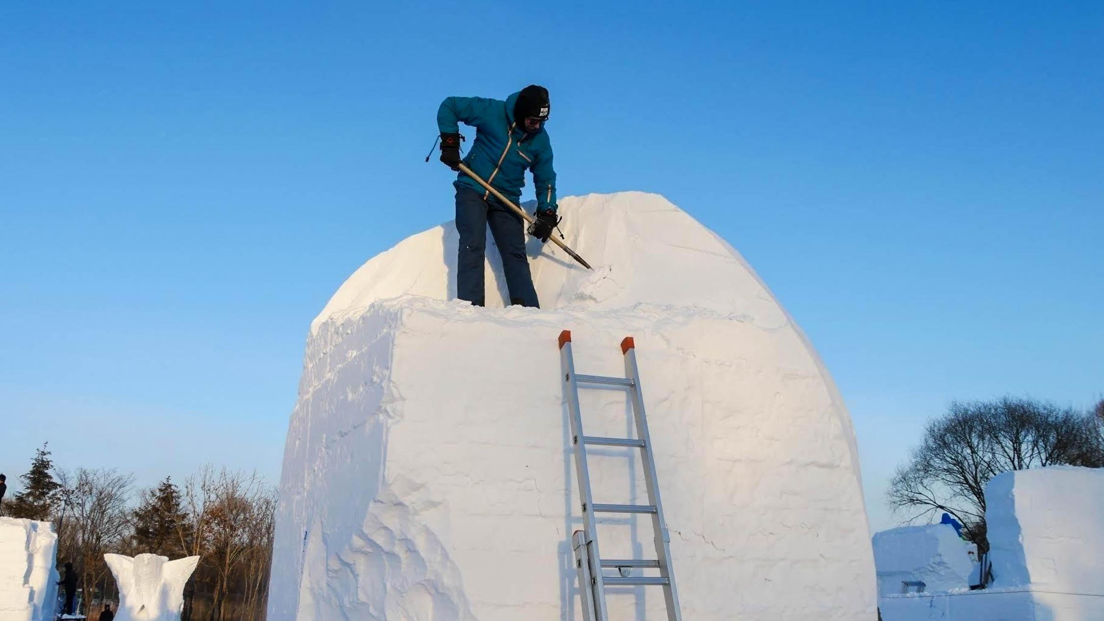 在摄氏零下33度的低温下,他们必须用三天半的时间,把一块冰冻的巨大雪块变成雕塑。