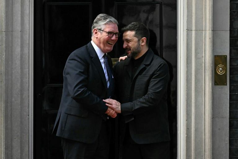 泽伦斯基和欧洲领袖与川普结束视讯会议数小时后,施凯尔在首相官邸唐宁街迎接泽伦斯基,两人握手且热情拥抱。