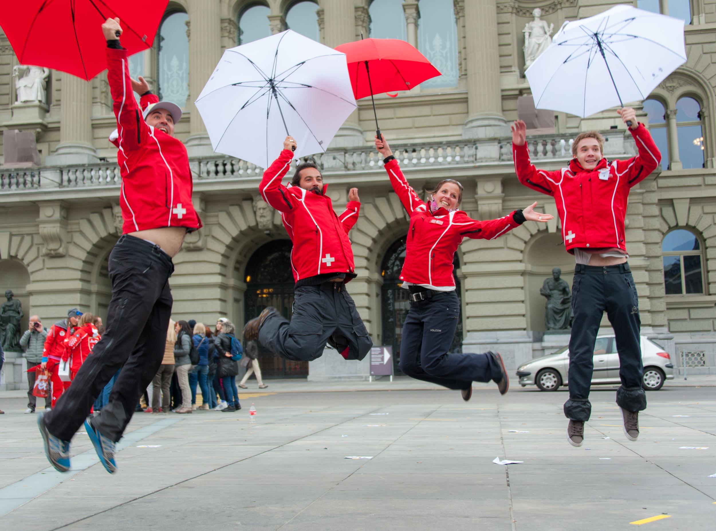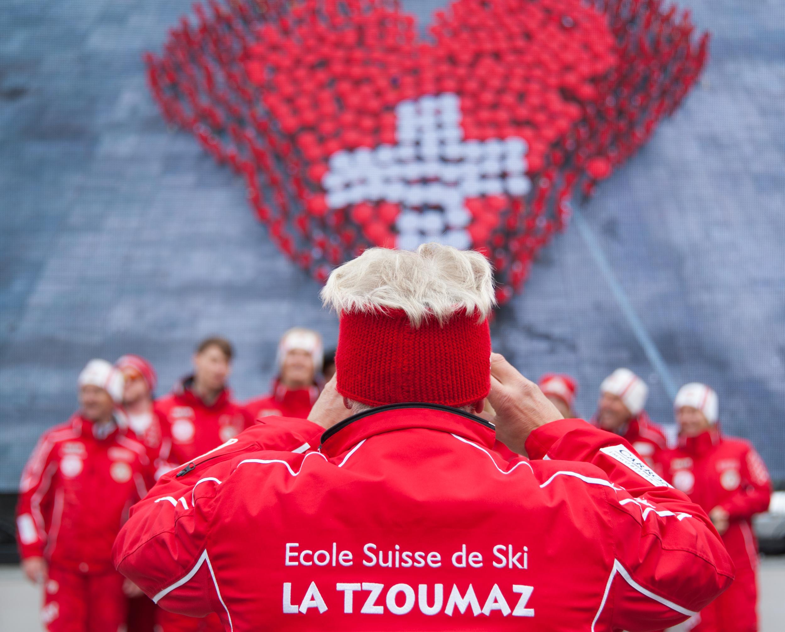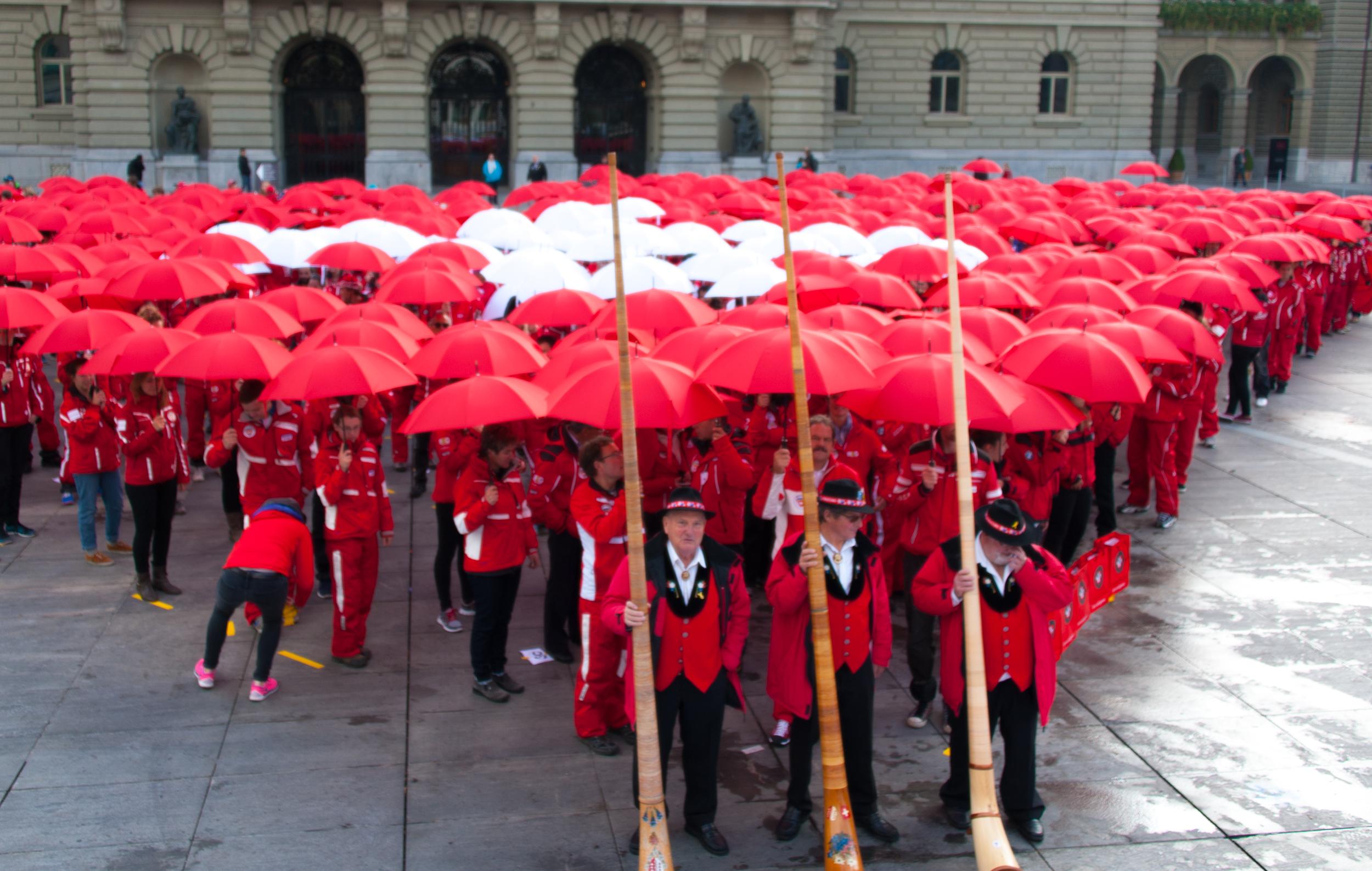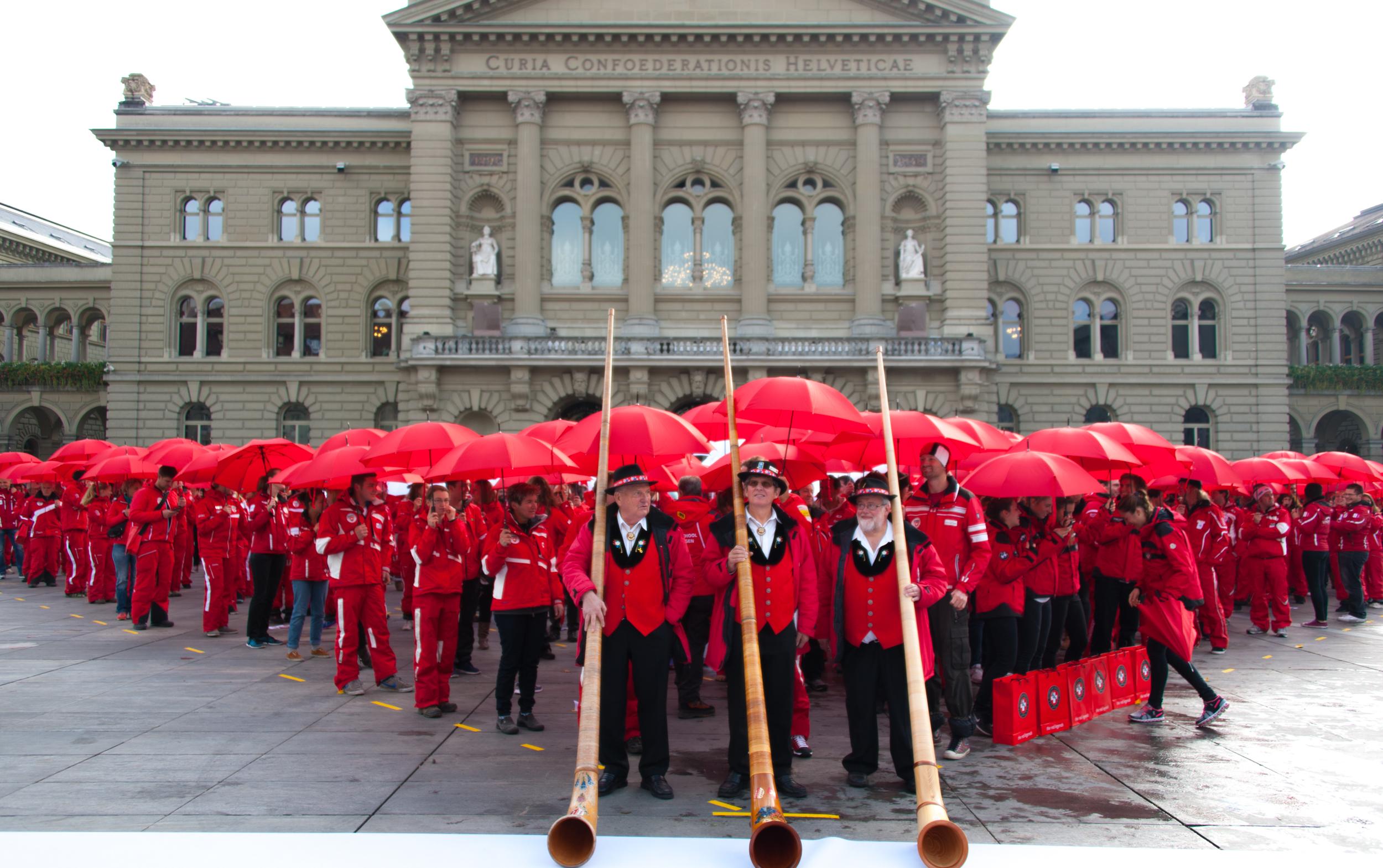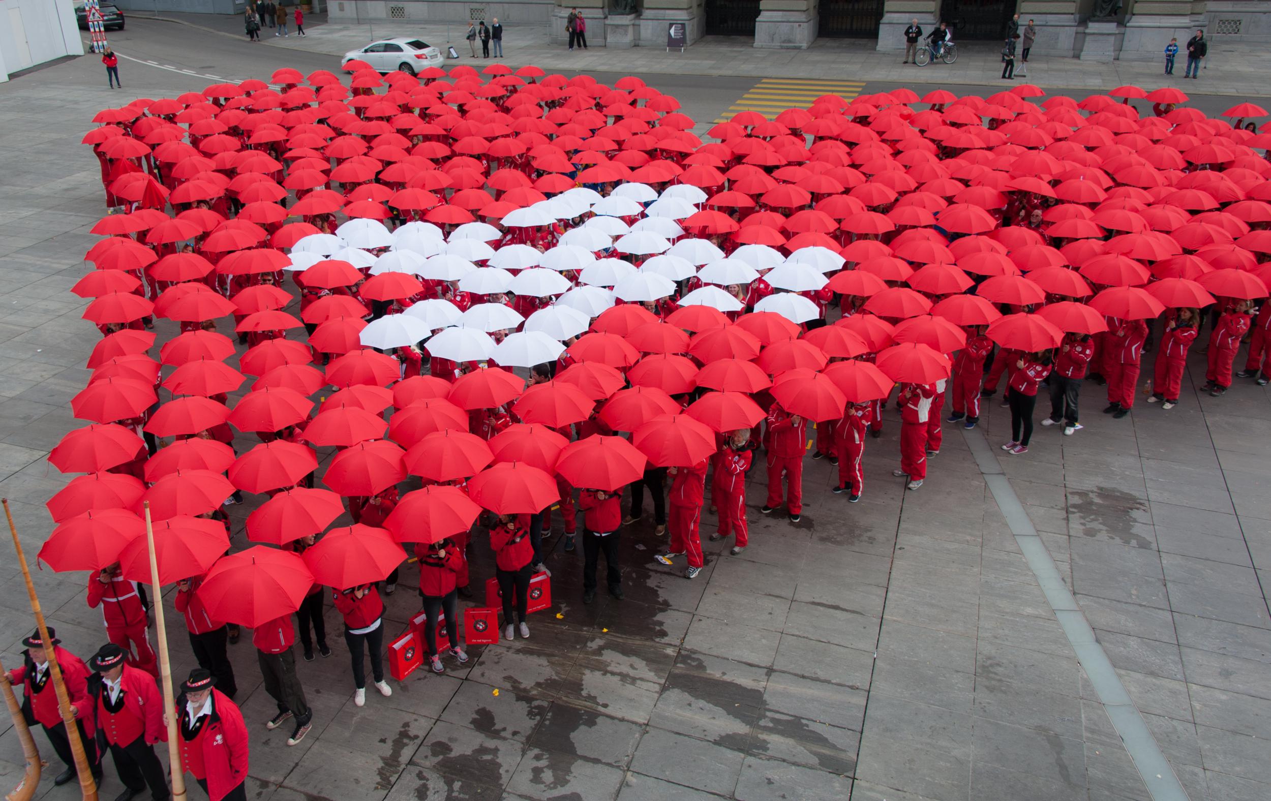 当深秋的阳光即将降下它最后一抹华美余晖的时候,瑞士各冬季旅游胜地的滑雪学校、雪上运动老师以及滑雪教练们已经为今年的第一场雪做好了准备。2015年10月31日,来自瑞士57个冬季运动场所的约500名滑雪教练齐聚首都伯尔尼,在联邦广场上用红色和白色雨伞拼出了一个巨大的象征瑞士国旗的心形图案。