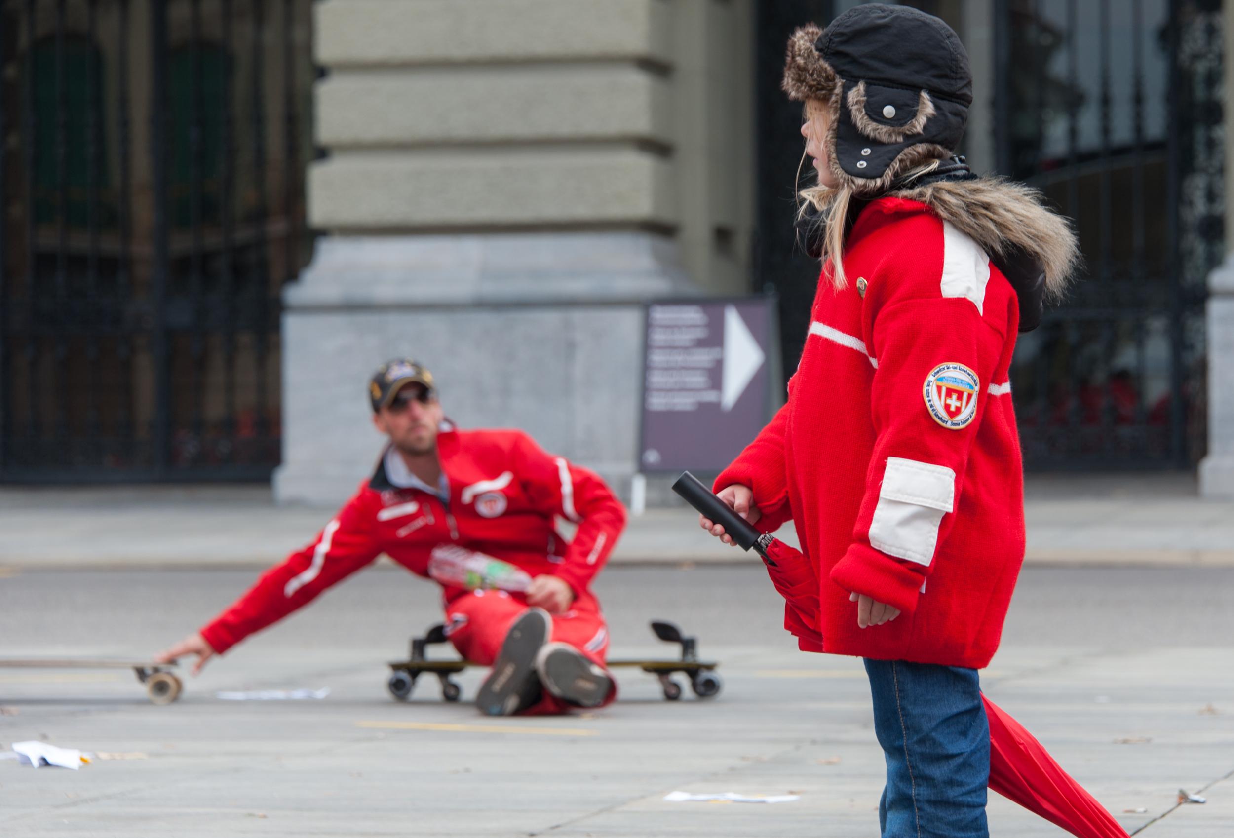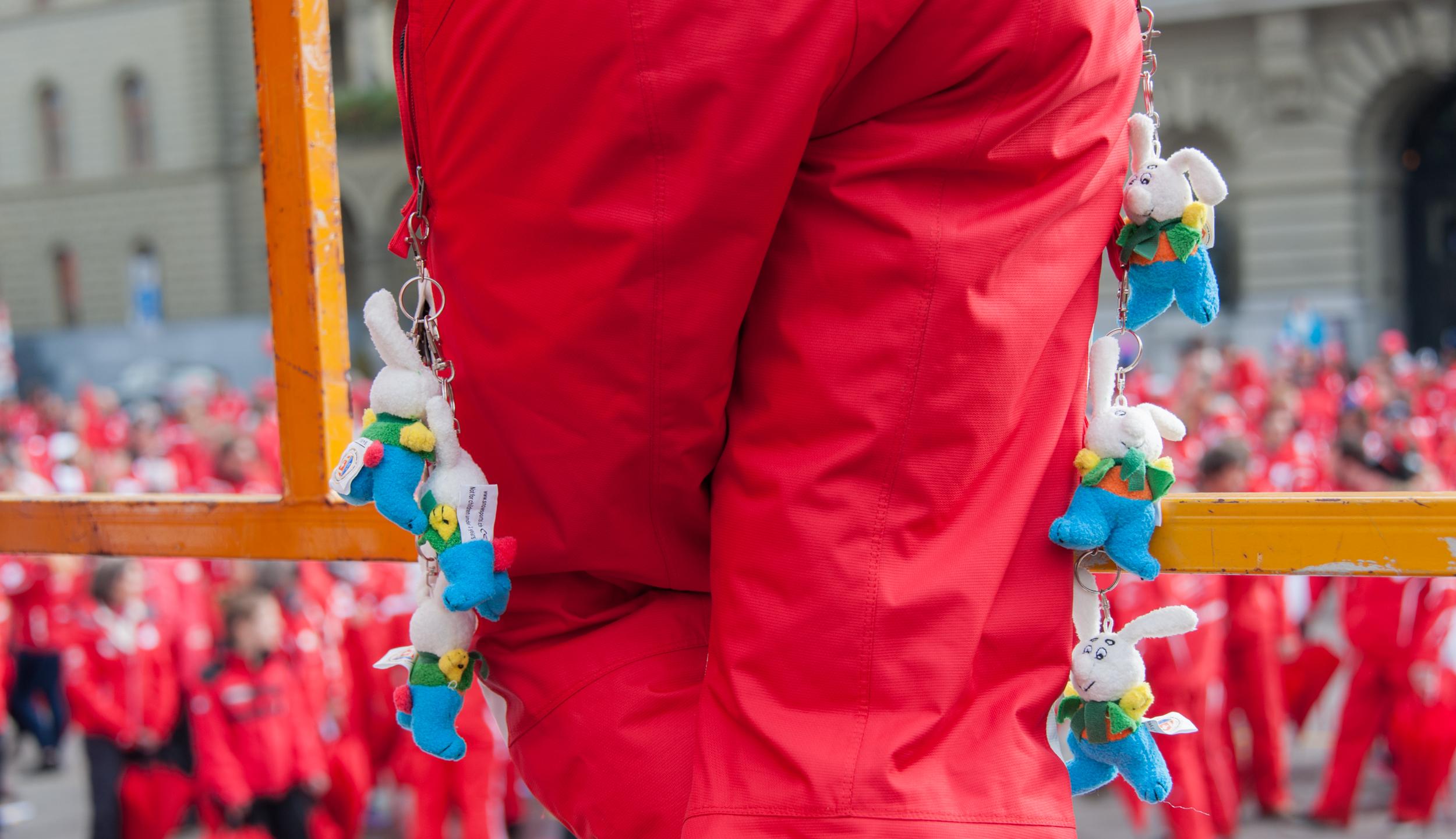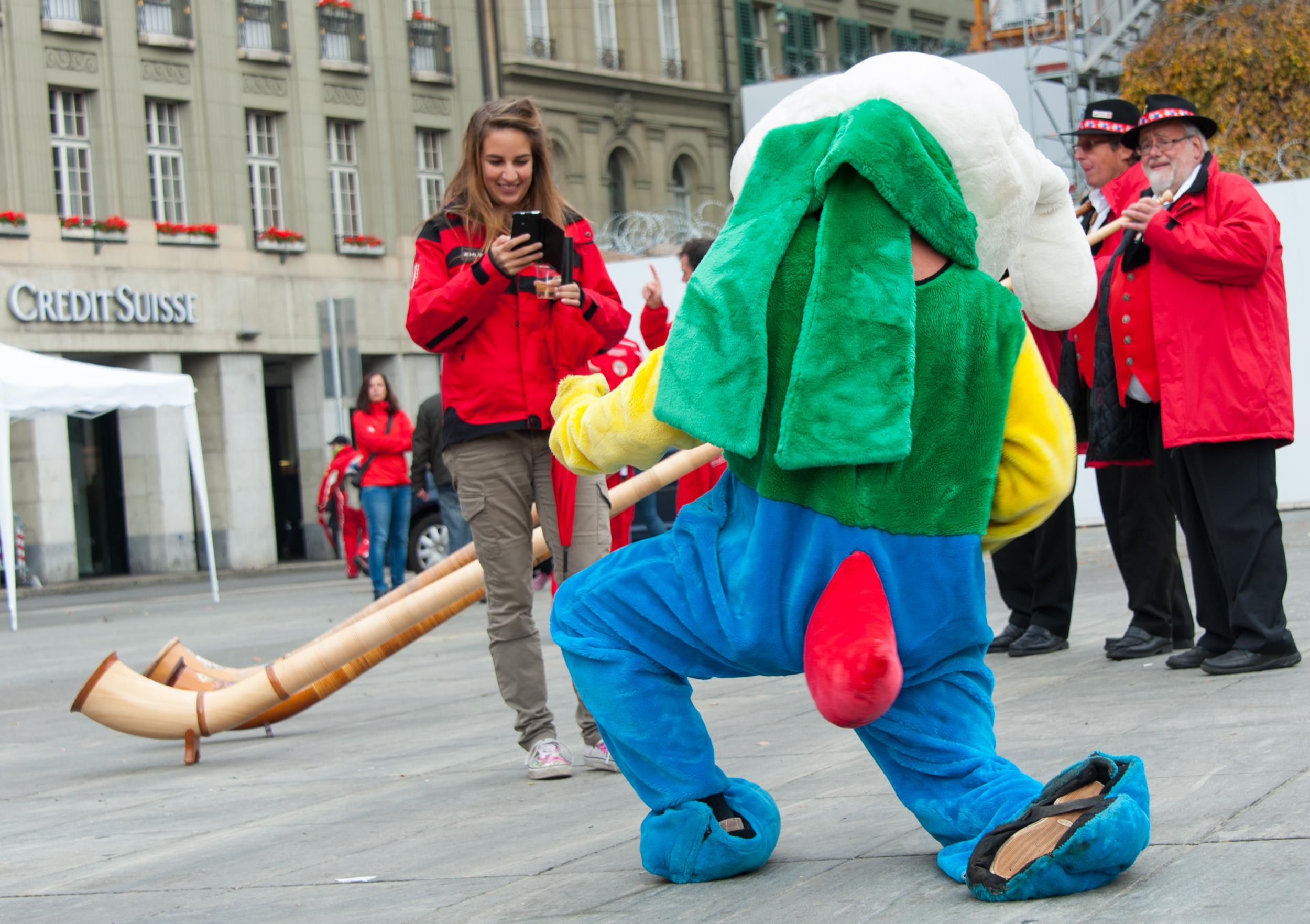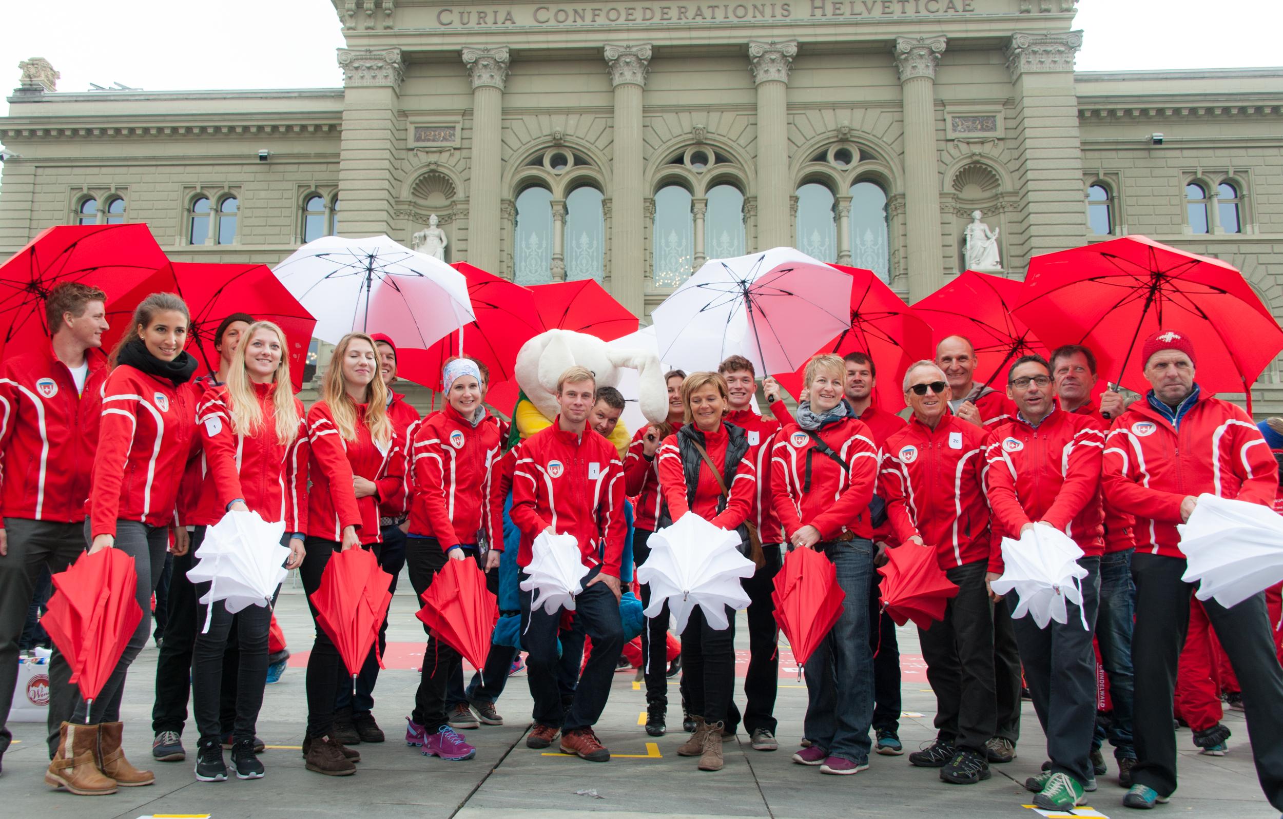 当深秋的阳光即将降下它最后一抹华美余晖的时候,瑞士各冬季旅游胜地的滑雪学校、雪上运动老师以及滑雪教练们已经为今年的第一场雪做好了准备。2015年10月31日,来自瑞士57个冬季运动场所的约500名滑雪教练齐聚首都伯尔尼,在联邦广场上用红色和白色雨伞拼出了一个巨大的象征瑞士国旗的心形图案。