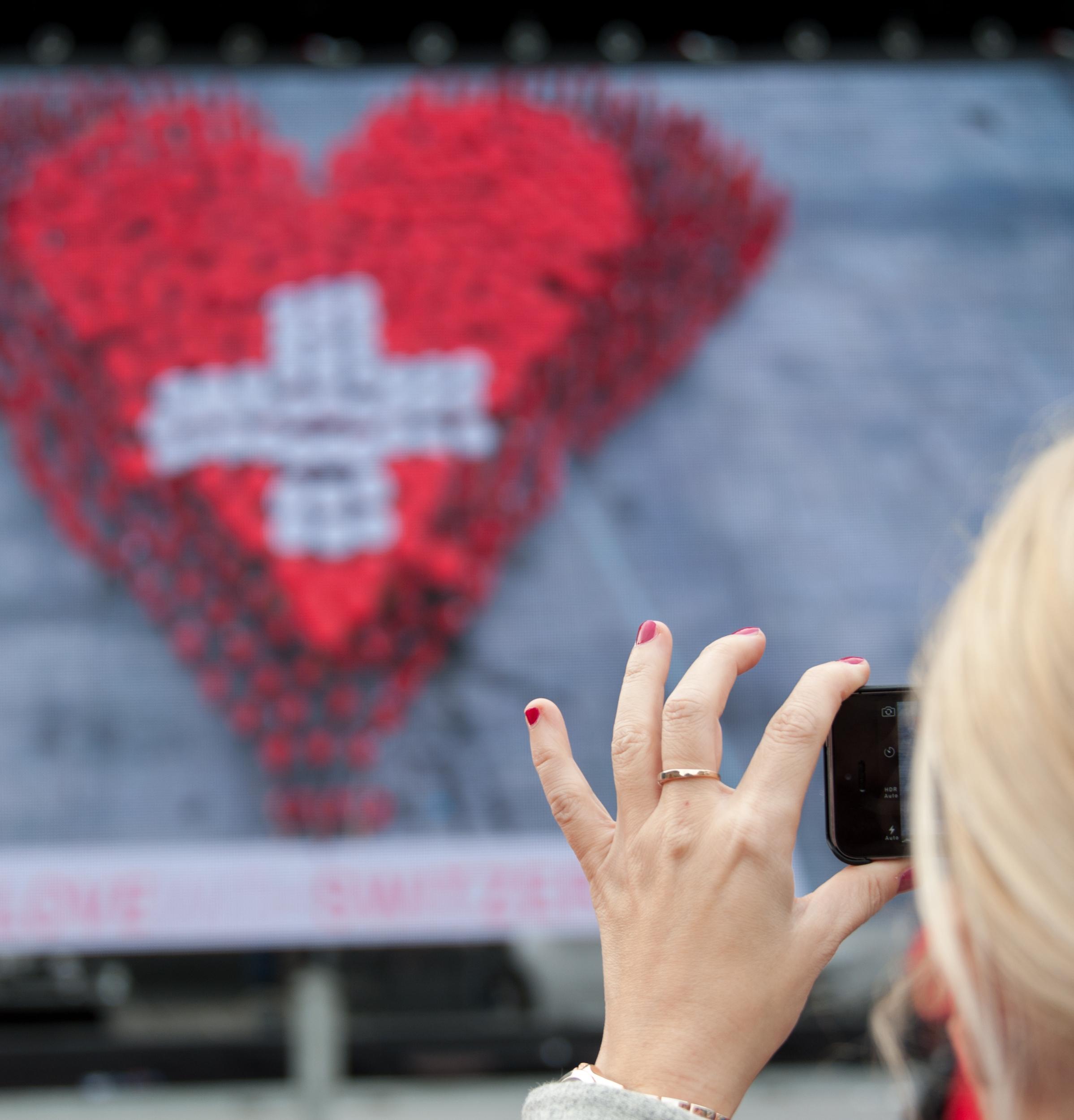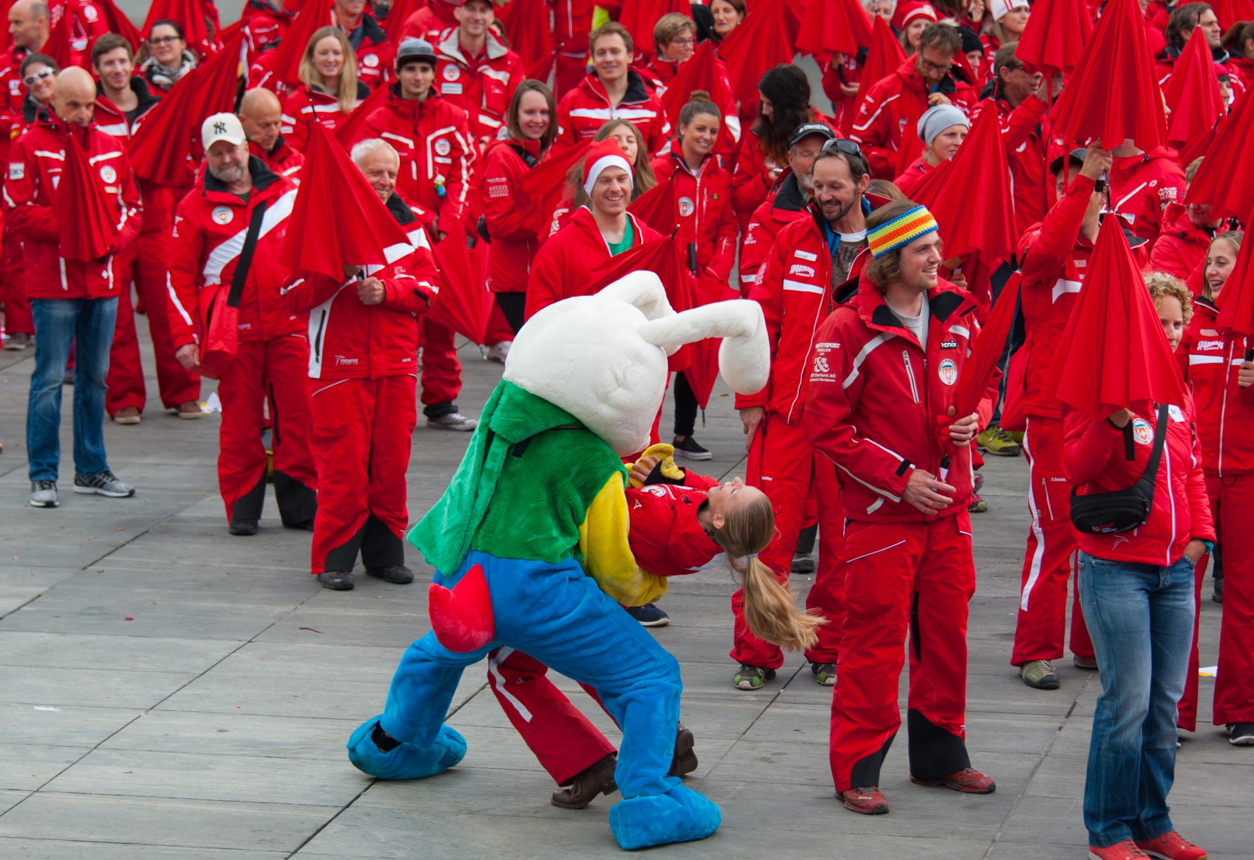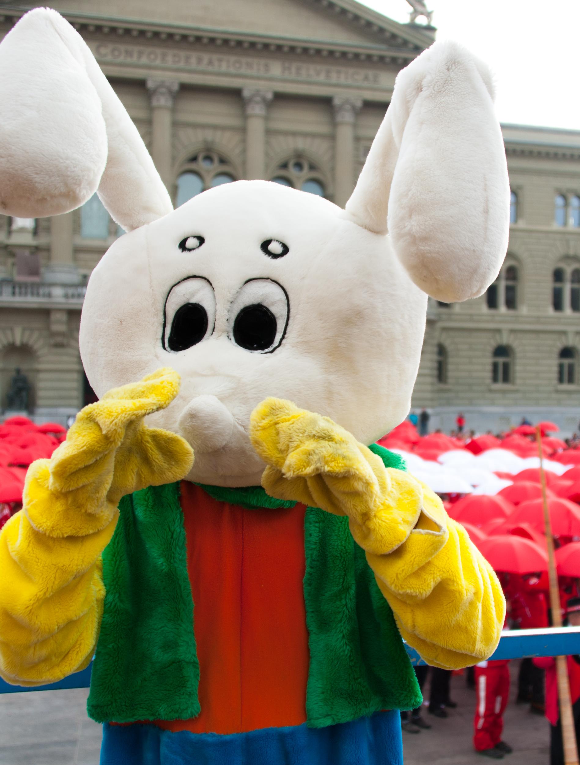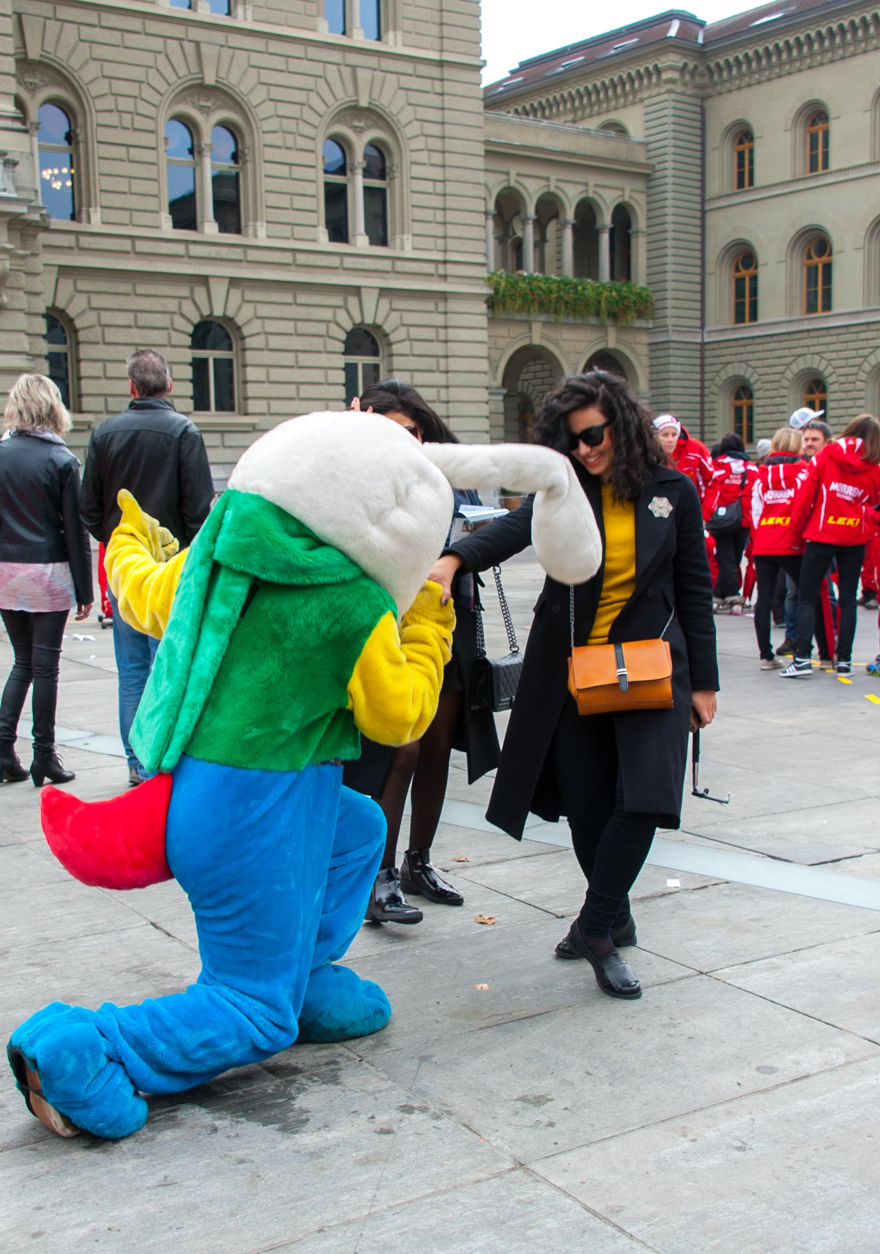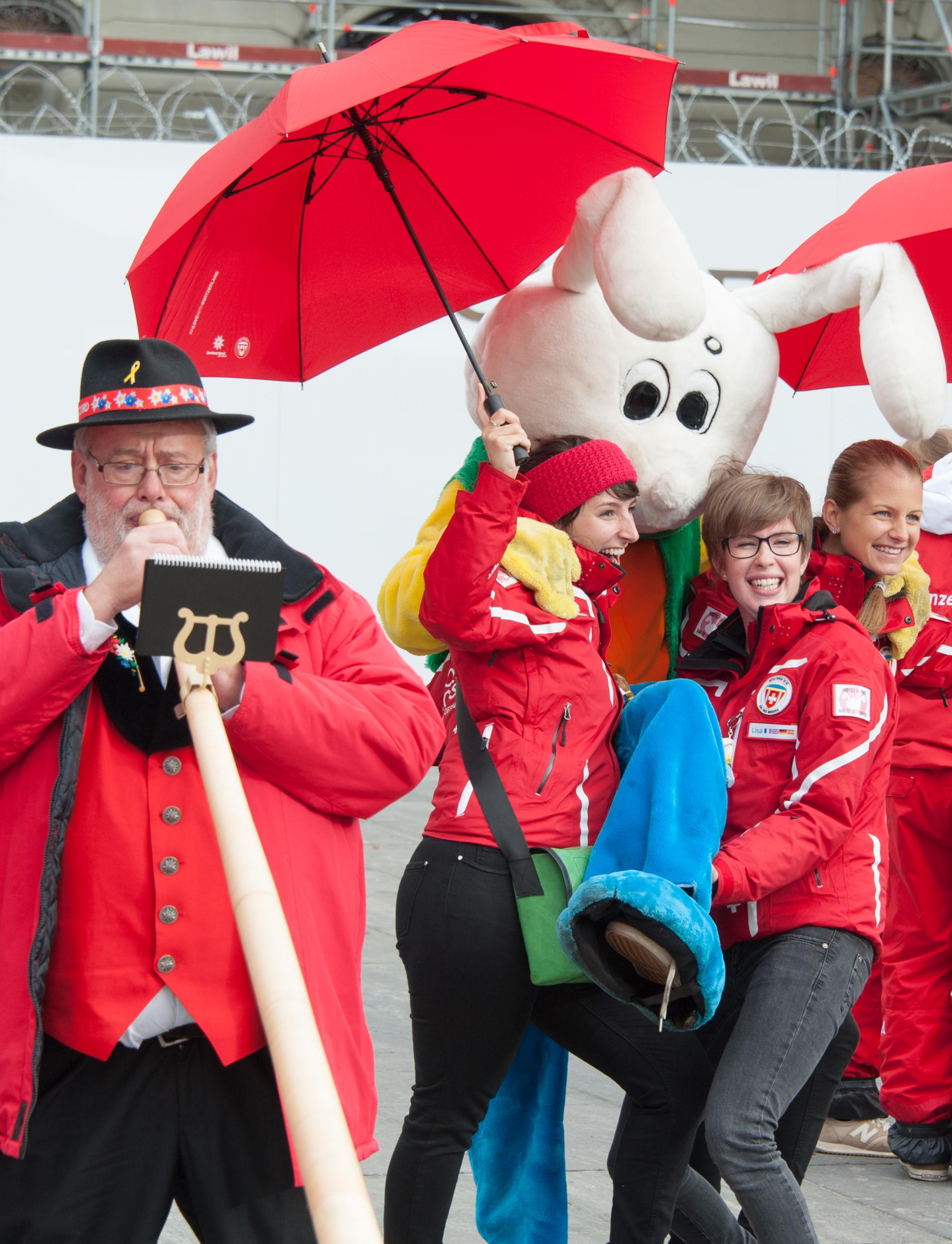 当深秋的阳光即将降下它最后一抹华美余晖的时候,瑞士各冬季旅游胜地的滑雪学校、雪上运动老师以及滑雪教练们已经为今年的第一场雪做好了准备。2015年10月31日,来自瑞士57个冬季运动场所的约500名滑雪教练齐聚首都伯尔尼,在联邦广场上用红色和白色雨伞拼出了一个巨大的象征瑞士国旗的心形图案。
