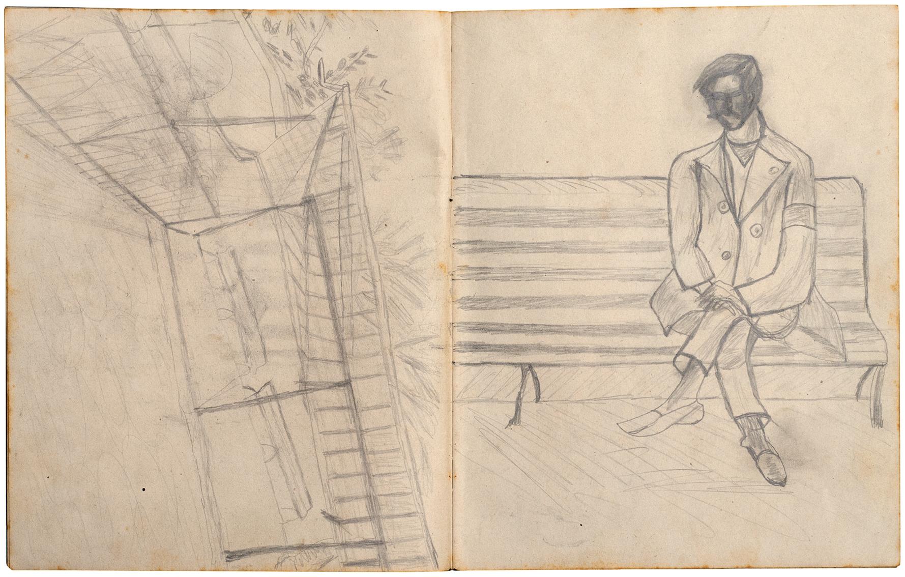 Adrien R. (1896-?),《无题》,公园长椅上的男人,封闭的花园,纸上铅笔画,日期不详,© collection Préfargier