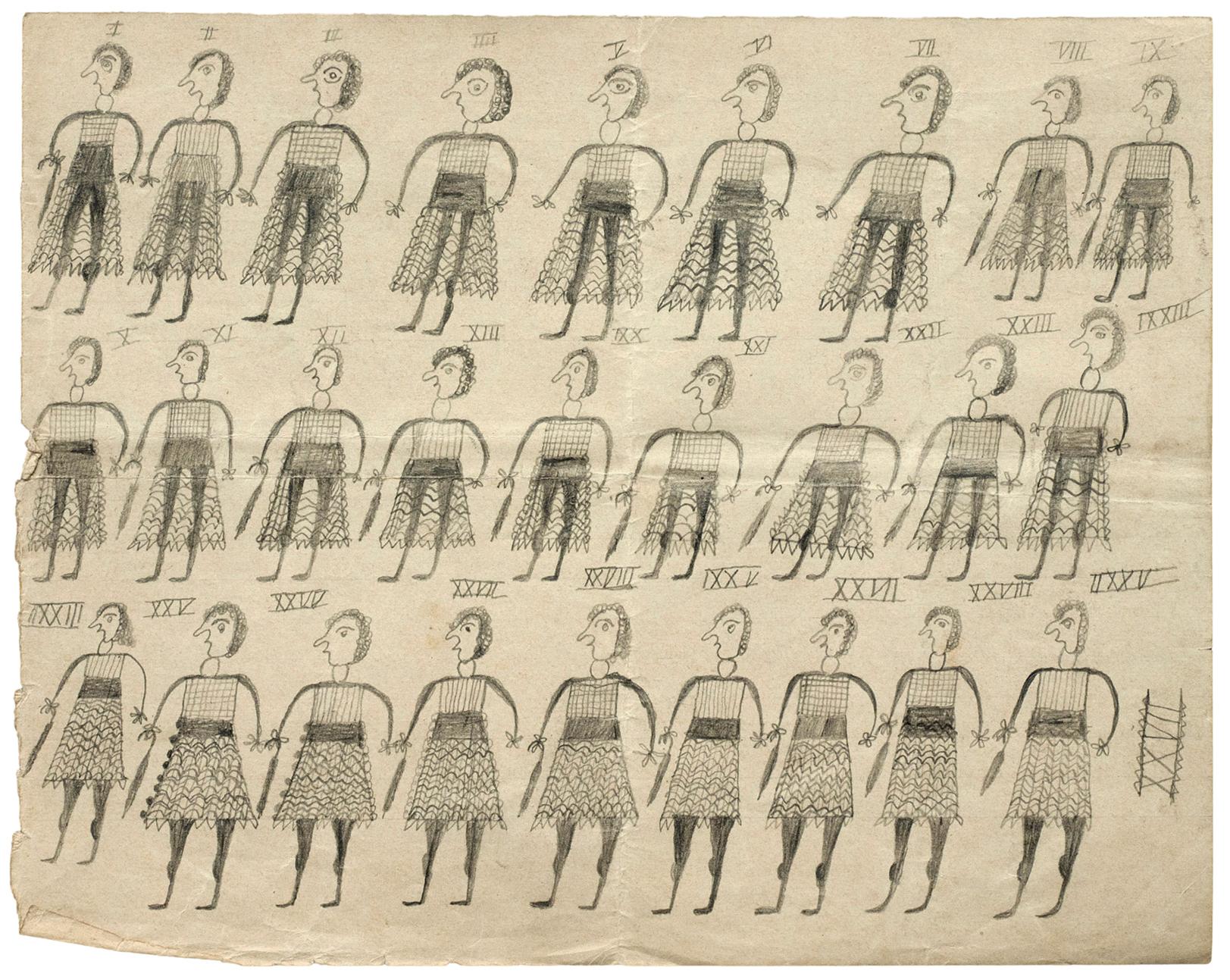 Andreas S. (1856–?),《无题》,女士们(21名持伞)和6名空手女士,纸上铅笔画,日期不限,© Collection Services Psychiatriques des Grisons