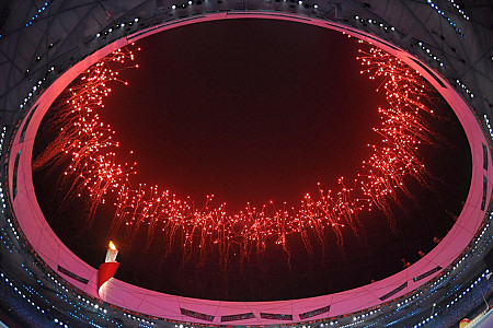 约9万名观众和运动员在瑞士建筑师设计的“鸟巢”体育馆中观看了闭幕式。