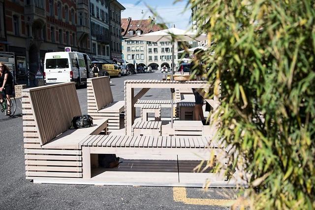 瑞士首都伯尔尼目前正在实行一个有趣的试点项目,在老城放置桌椅板凳和遮阳伞围出休闲角。这一活动将持续2个月的时间。