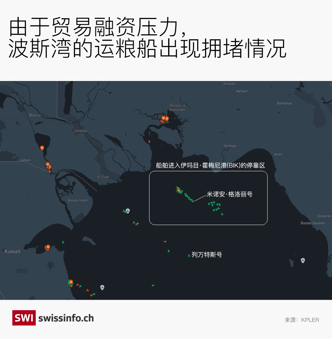 伊朗央行也在对小麦等基础商品的补贴体系中居于核心地位,该体系通过提供优惠汇率给贸易商,使他们能够以较低的成本进口商品。然而,伊朗央行无法及时满足贸易商对于硬通货的需求,这导致粮食运输船在伊朗港口外滞留数月,等待进口商支付货款(见图)。