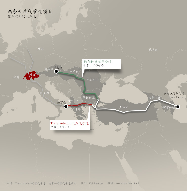 究竟谁会成为赢家,今年6月将会揭开谜底。胜出者将负责把里海富饶气田中开采的天然气输运到欧洲。其重要性不只意味着几十亿瑞郎的生意,而且还意味着创立一条新的“东南部天然气走廊”-瑞士和欧盟认为其具有重要的战略意义。
