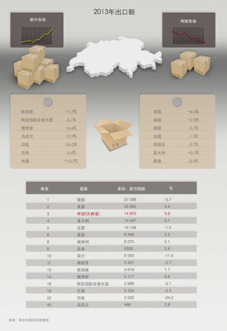 根据瑞士联邦海关管理局的消息,2013年瑞士共向中国(含香港)出口物资149亿瑞郎,比前年增长3.6%。2003-2013十年间,瑞士面向中国的出口额翻了一番。