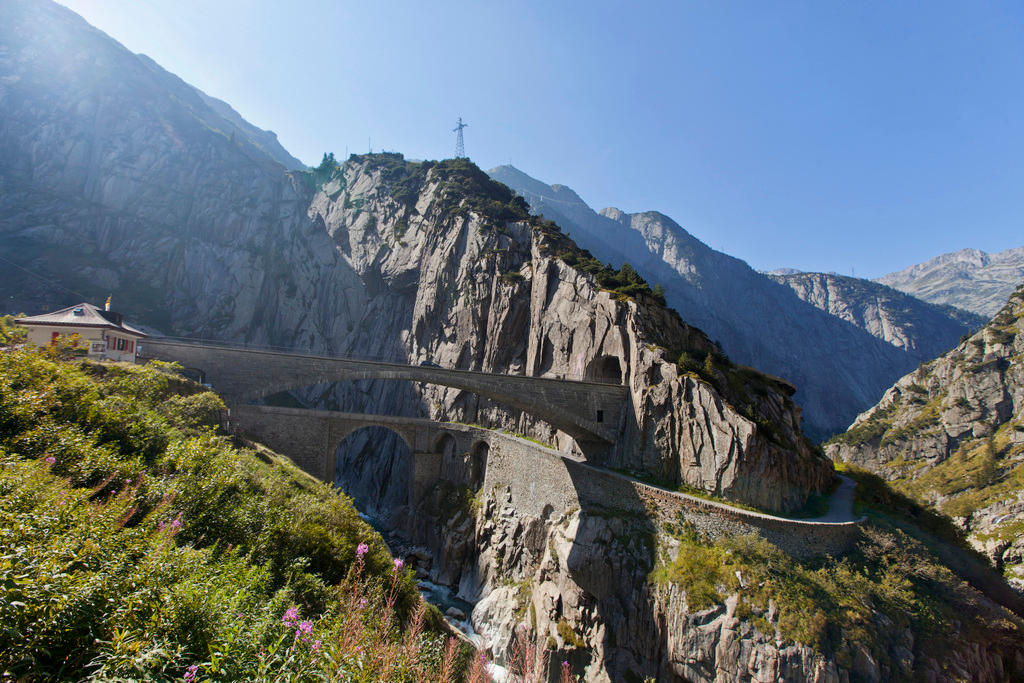 其实,沿四州湖南下才是施瓦本和伦巴第之间的最短路线,但需要越过一座高山。它属于阿尔卑斯主脉,是地中海和北海的分水岭,罗伊斯河、阿勒河、罗纳河和提契诺河在此同源殊途。人们早就知道,山上有处隘口,海拔仅略高于2100米,唯其北侧的罗伊斯河在雪轮峡(Schöllenenschlucht)构成天堑,不知曾教多少旅人望崖兴叹。直到1220年前后,附近山民才在峭壁上打入木桩,用铁锁和木板架起一座60米长的栈道(Twärrenbrücke)。十年后,一座木桥排除了通行的最后障碍,直至1595年升级为歌德所见的石桥。