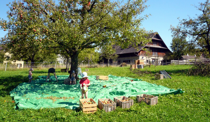 顺应四季分明的气候,吕内克农场每一季都有当季的特色课程,像是:秋季的苹果采收和榨苹果汁课程就非常受欢迎。秋收时,孩子在摘采的过程中也会发现-果园里不洒农药、鲜少人工介入的苹果不只是长得大小不一,有的还有虫蛀的痕迹、被鸟儿啄过的小洞。未曾过多修剪的叶片,让苹果每一面接受日照的程度各异,熟红的颜色也就产生了不同的层次。非大量栽种的水果,每一颗都长出了自己的样子,秋收的果实充满了生命故事,和在超市里购得的苹果非常不同。孩子不仅仅是亲手完成农场的工作,更从自己的观察里感受到真正的生命成长、绽放与结束,这些远胜过书里的文字或图像描述,是更具穿透力的教育。认识自然,也是认识生命。