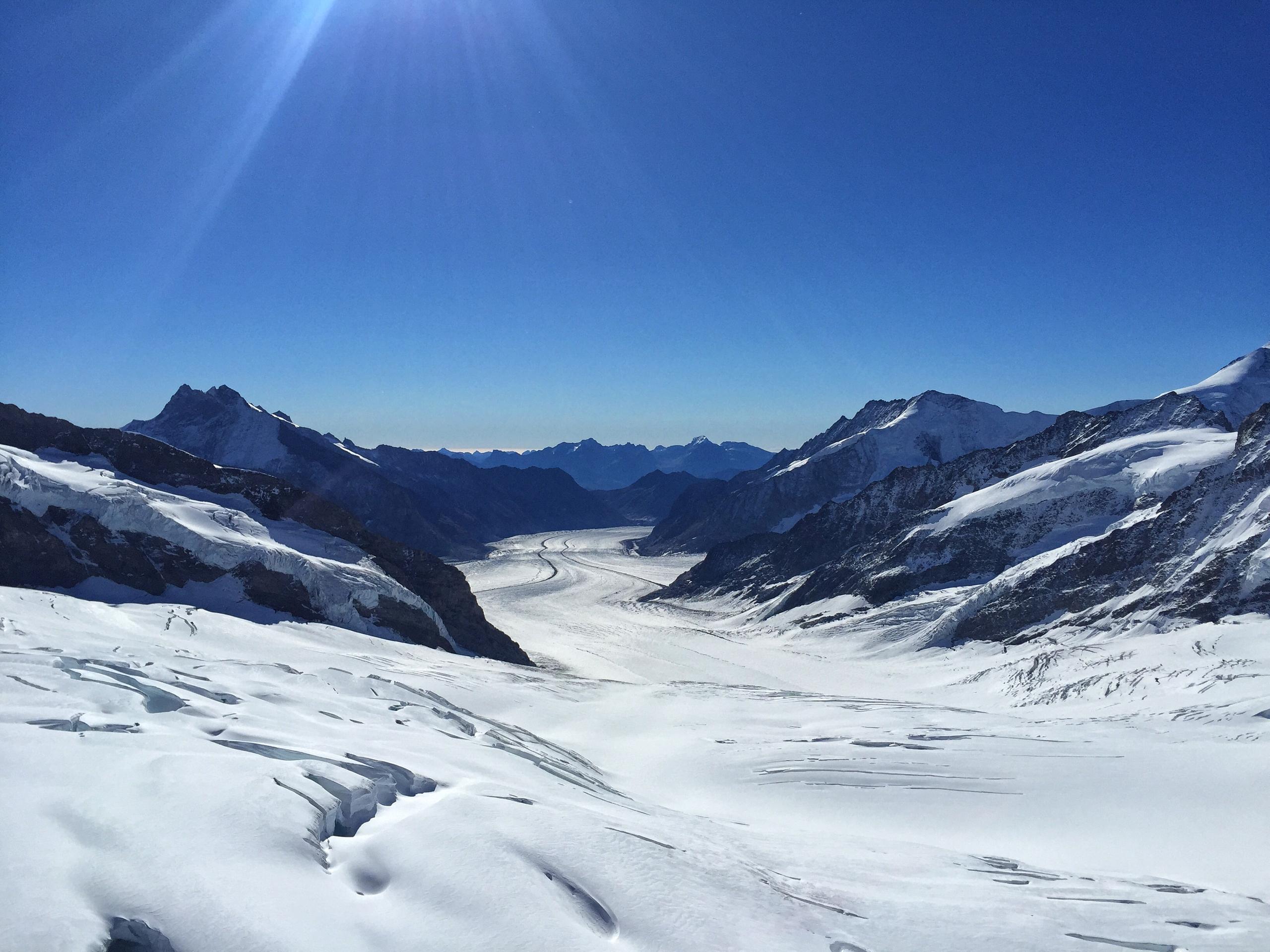 一个多小时后,终于到达了阿莱奇冰川小屋,小屋只能徒手攀爬上去,屋子的台阶全的是冰,一不注意就会滑倒,还会有跌落的危险。但我们仍然手牵手度过难关,终于艰难的爬到了小屋的观景台,眺望出去是著名的阿莱奇冰川,无边的雪原,湛蓝的天空,我想我们只能想到仙境来形容,强烈的征服感油然而生。最美的景在眼前,最爱的人在身边,那一刻,别无他求。