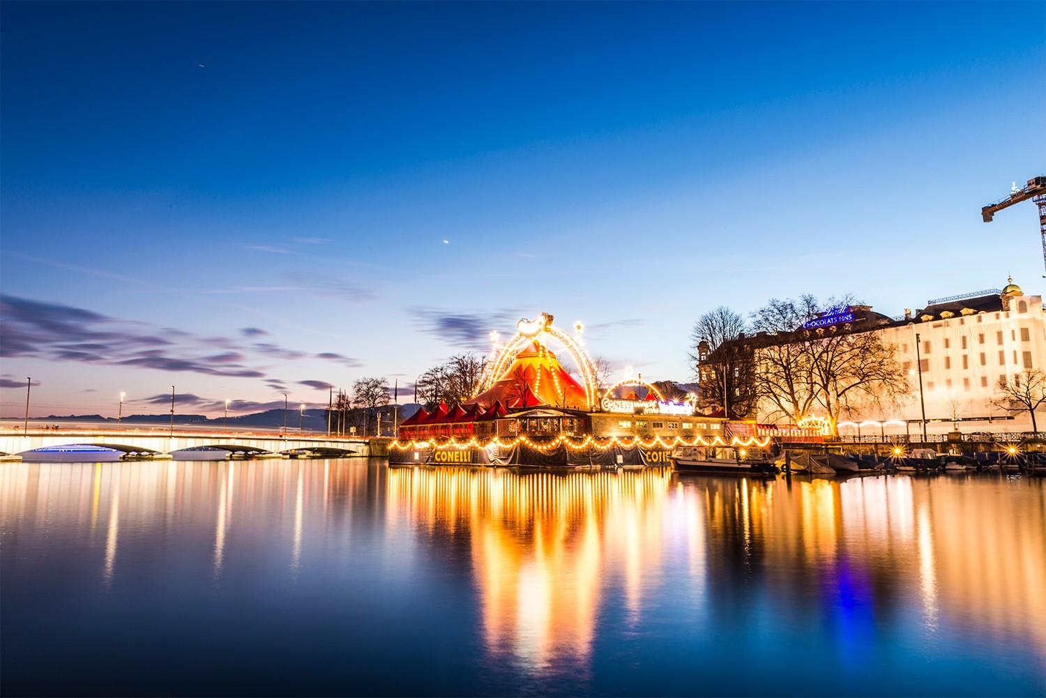 天高云淡, 紫黛色的苍穹下,一座金光灿烂的红色帐篷矗立在横跨利马特河的拱桥旁。定睛细看,数颗闪闪发光的星型花环牵引着数条徐徐生辉的悬浮灯光彩带,明亮耀眼的金色灯光组合在大帐篷顶部赫然呈现着“CONELLI”几个大写字母。 数个形状乖巧可爱的尖顶小帐篷簇拥在大帐篷的身旁,如同几位忠诚的卫士守护着一顶端庄的皇冠。一条弧线优美的灯光彩带环绕在大小帐篷的周围,在海蓝色水面上映射出妩媚迷人的光影。数只被笔直的木桩紧紧栓住的小船,目不转睛地盯着一只孤独的天鹅在明镜般光滑的水面上优雅地旋转、浮游。仿佛闯入一个美丽的童话王国,我情不自禁地欢呼起来:“真美呀!” “这是哪里呢?”仔细定位之后发现,这美丽的童话王国并不是一座飘浮在利马特河上的大型圣诞节灯饰船坞,而是座落在一个十分不起眼的河边小小水泥台上的大型马戏团。兴奋地拍摄之后,我仍然舍不得离开。站在河岸上,静静地观赏了很久。