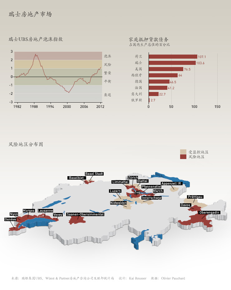 瑞士政府充分意识到了风险的存在,呼吁谨慎行事。2012年2月,联邦财政部(DFF)的“金融稳定工作组”提交了一份题为《瑞士宏观审慎监管》的报告,文中指出:“高额负债很大程度地让瑞士家庭面临风险,比如利率的急剧上升。如果贷款利率的上升引起房屋价格的下跌并超过家庭偿还利息的能力,那么房地产市场就会受到冲击。因此,政府应该避免任何可能鼓励家庭过度贷款的财政政策。”