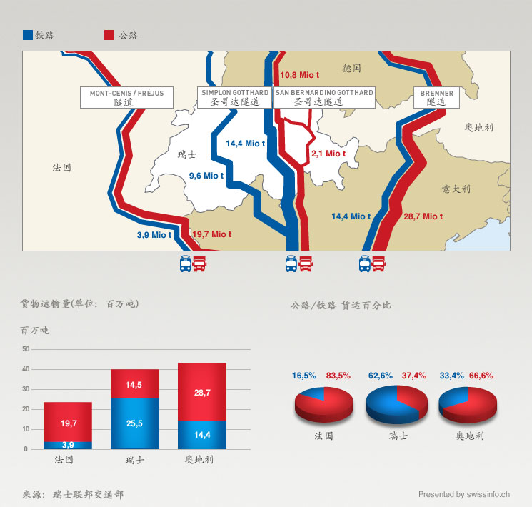 与邻国奥地利(33.4%)和法国(16.5%)相比,瑞士(62.6%)的阿尔卑斯铁路货运比例最高(2010数据)。