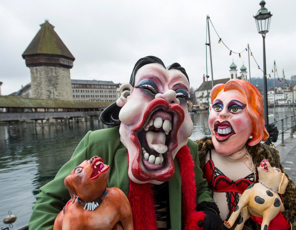 2014年的狂欢节上,这对在卢塞恩著名的卡贝尔桥前留影的夫妇十分抢眼。 swissinfo.ch