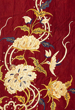 这些丝织品以其绚丽的色彩、细致的纹络和精美的刺绣令世人惊讶不已。一件深红色的丝绸上衣的最外层是一层丝织细纱,上面绣着美丽的花朵和生动的飞鸟图案。还有一条深蓝色的裙子,上面绣有龙图。